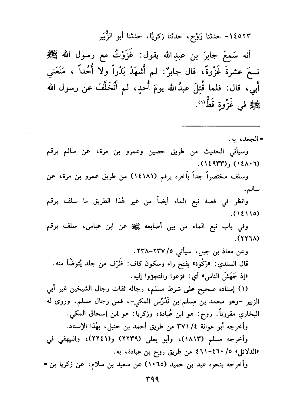 ١٤٥٢٣ - حَدَّثَنَا رَوْحٌ، حَدَّثَنَا زَكَرِيَّا، حَدَّثَنَا أَبُو الزُّبَيْرِ، أَنَّهُ سَمِعَ جَابِرَ بْنَ عَبْدِ اللهِ، يَقُولُ: " غَزَوْتُ مَعَ رَسُولِ اللهِ صَلَّى اللهُ عَلَيْهِ وَسَلَّمَ تِسْعَ عَشْرَةَ غَزْوَةً "، قَالَ جَابِرٌ: " لَمْ أَشْهَدْ بَدْرًا، وَلَا أُحُدًا، مَنَعَنِي أَبِي "، قَالَ: " فَلَمَّا قُتِلَ عَبْدُ اللهِ يَوْمَ أُحُدٍ، لَمْ أَتَخَلَّفْ عَنْ رَسُولِ اللهِ صَلَّى اللهُ عَلَيْهِ وَسَلَّمَ فِي غَزْوَةٍ قَطُّ " (١)