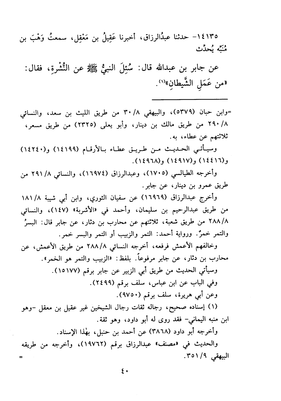 ١٤١٣٥ - حَدَّثَنَا عَبْدُ الرَّزَّاقِ، أَخْبَرَنَا عَقِيلُ بْنُ مَعْقِلٍ، سَمِعْتُ وَهْبَ بْنَ مُنَبِّهٍ، يُحَدِّثُ عَنْ جَابِرِ بْنِ عَبْدِ اللهِ، قَالَ: سُئِلَ النَّبِيُّ صَلَّى اللهُ عَلَيْهِ وَسَلَّمَ عَنِ النَّشْرَةِ، فَقَالَ: " مِنْ عَمَلِ الشَّيْطَانِ " (١)
