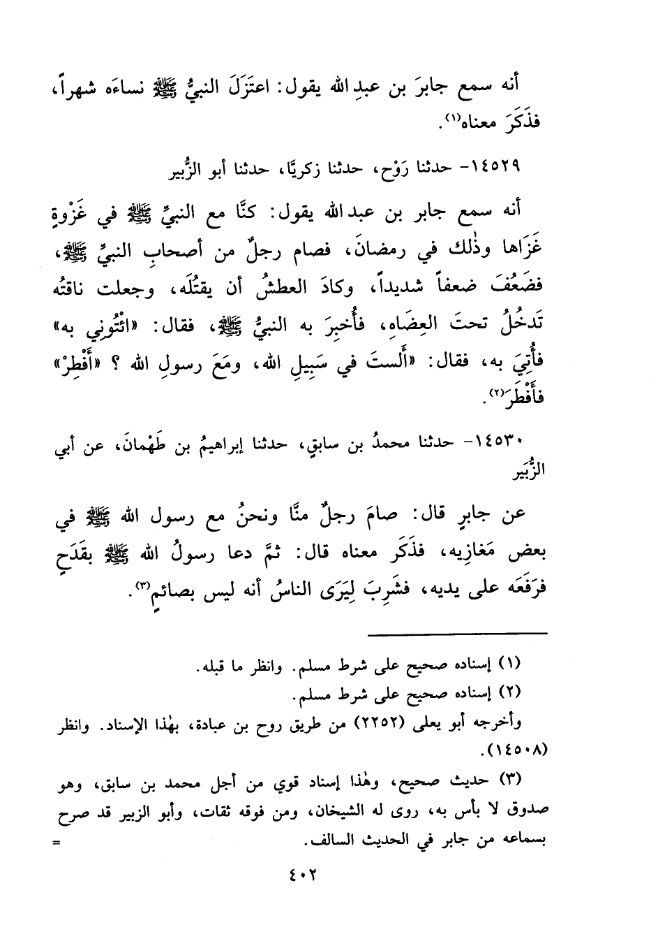١٤٥٣٠ - حَدَّثَنَا مُحَمَّدُ بْنُ سَابِقٍ، حَدَّثَنَا إِبْرَاهِيمُ بْنُ طَهْمَانَ، عَنْ أَبِي الزُّبَيْرِ، عَنْ جَابِرٍ، قَالَ: صَامَ رَجُلٌ مِنَّا، وَنَحْنُ مَعَ رَسُولِ اللهِ صَلَّى اللهُ عَلَيْهِ وَسَلَّمَ فِي بَعْضِ مَغَازِيهِ، فَذَكَرَ مَعْنَاهُ، قَالَ: ثُمَّ دَعَا رَسُولُ اللهِ صَلَّى اللهُ عَلَيْهِ وَسَلَّمَ بِقَدَحٍ، فَرَفَعَهُ عَلَى يَدَيْهِ، فَشَرِبَ لِيَرَى النَّاسُ أَنَّهُ لَيْسَ بِصَائِمٍ (٣)