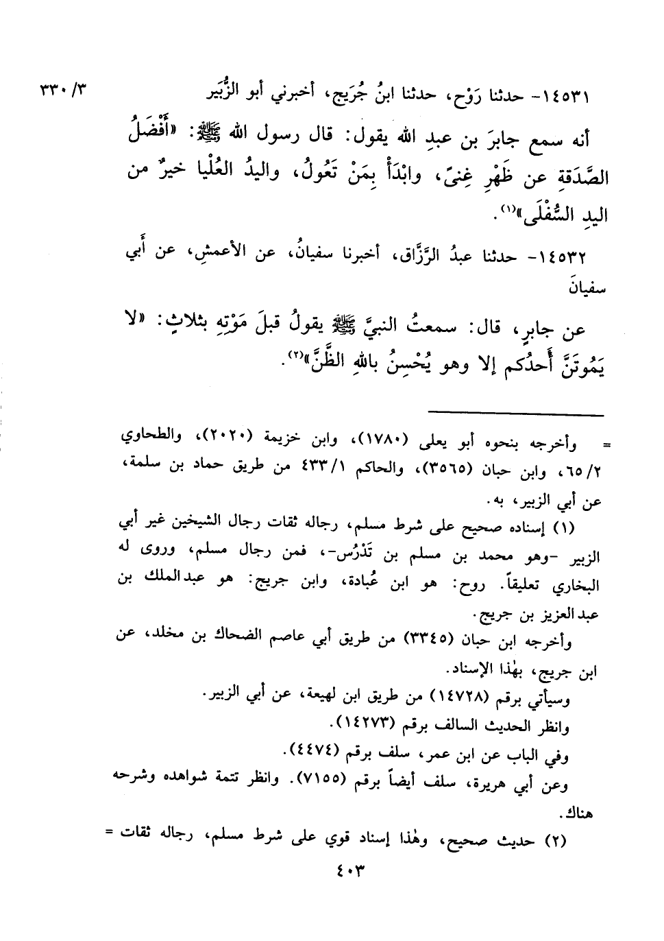 ١٤٥٣٢ - حَدَّثَنَا عَبْدُ الرَّزَّاقِ، أَخْبَرَنَا سُفْيَانُ، عَنِ الْأَعْمَشِ، عَنْ أَبِي سُفْيَانَ، عَنْ جَابِرٍ، قَالَ: سَمِعْتُ رَسُولَ اللهِ صَلَّى اللهُ عَلَيْهِ وَسَلَّمَ يَقُولُ قَبْلَ مَوْتِهِ بِثَلَاثٍ، " لَا يَمُوتَنَّ أَحَدُكُمْ إِلَّا وَهُوَ يُحْسِنُ بِاللهِ الظَّنَّ " (٢)