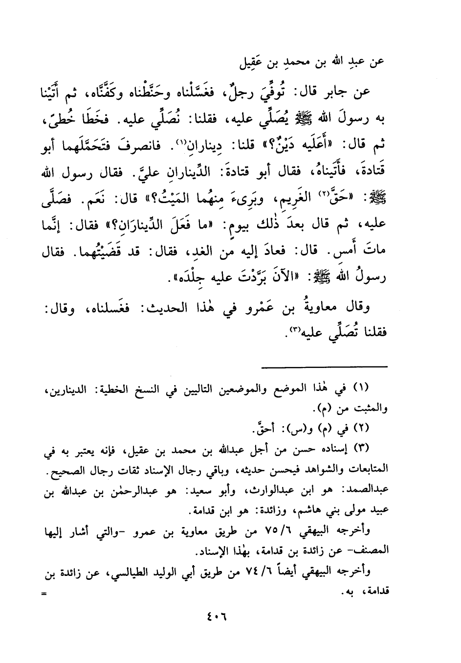 عَنْ عَبْدِ اللهِ بْنِ مُحَمَّدِ بْنِ عَقِيلٍ، عَنْ جَابِرٍ، قَالَ: تُوُفِّيَ رَجُلٌ فَغَسَّلْنَاهُ، وَحَنَّطْنَاهُ، وَكَفَّنَّاهُ، ثُمَّ أَتَيْنَا بِهِ رَسُولَ اللهِ صَلَّى اللهُ عَلَيْهِ وَسَلَّمَ يُصَلِّي عَلَيْهِ، فَقُلْنَا: تُصَلِّي عَلَيْهِ؟ فَخَطَا خُطًى، ثُمَّ قَالَ: " أَعَلَيْهِ دَيْنٌ؟ " قُلْنَا: دِينَارَانِ، (١) فَانْصَرَفَ، فَتَحَمَّلَهُمَا أَبُو قَتَادَةَ، فَأَتَيْنَاهُ، فَقَالَ أَبُو قَتَادَةَ: الدِّينَارَانِ عَلَيَّ، فَقَالَ رَسُولُ اللهِ صَلَّى اللهُ عَلَيْهِ وَسَلَّمَ: " حَقُّ (٢) الْغَرِيمُ، وَبَرِئَ مِنْهُمَا الْمَيِّتُ؟ " قَالَ: نَعَمْ، فَصَلَّى عَلَيْهِ، ثُمَّ قَالَ بَعْدَ ذَلِكَ بِيَوْمٍ: " مَا فَعَلَ الدِّينَارَانِ؟ "فَقَالَ: إِنَّمَا مَاتَ أَمْسِ، قَالَ: فَعَادَ إِلَيْهِ مِنَ الْغَدِ، فَقَالَ: لَقَدْ قَضَيْتُهُمَا، فَقَالَ رَسُولُ اللهِ صَلَّى اللهُ عَلَيْهِ وَسَلَّمَ: " الْآنَ بَرَدَتْ عَلَيْهِ جِلْدُهُ "، وَقَالَ مُعَاوِيَةُ بْنُ عَمْرٍو فِي هَذَا الْحَدِيثِ: فَغَسَّلْنَاهُ، وَقَالَ: فَقُلْنَا: تُصَلِّي عَلَيْهِ (٣)