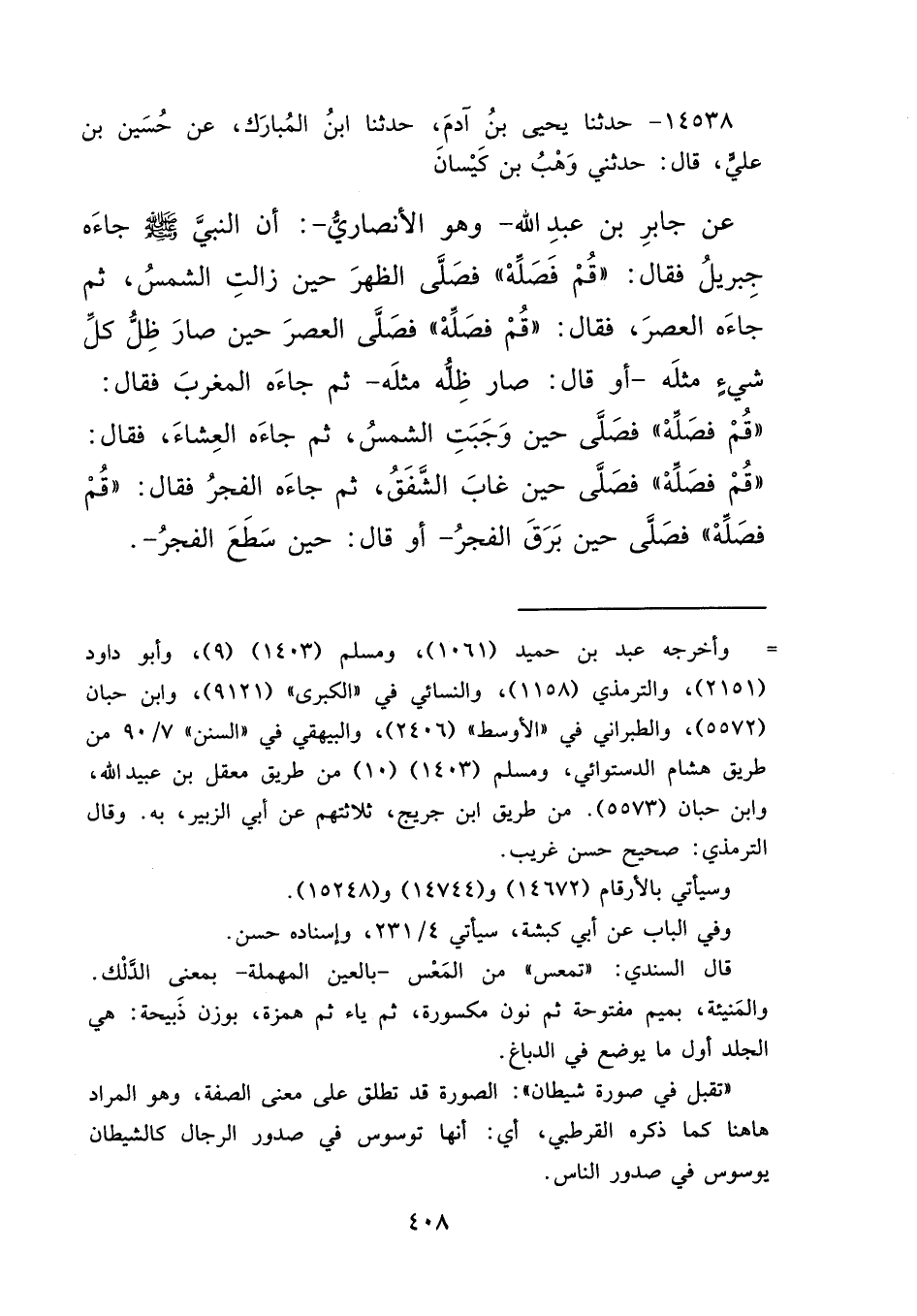 ١٤٥٣٨ - حَدَّثَنَا يَحْيَى بْنُ آدَمَ، حَدَّثَنَا ابْنُ الْمُبَارَكِ، عَنْ حُسَيْنِ بْنِ عَلِيٍّ، قَالَ: حَدَّثَنِي وَهْبُ بْنُ كَيْسَانَ، عَنْ جَابِرِ بْنِ عَبْدِ اللهِ وَهُوَ الْأَنْصَارِيُّ، " أَنَّ النَّبِيَّ صَلَّى اللهُ عَلَيْهِ وَسَلَّمَ جَاءَهُ جِبْرِيلُ، فَقَالَ: قُمْ فَصَلِّهْ، فَصَلَّى الظُّهْرَ حِينَ زَالَتِ الشَّمْسُ، ثُمَّ جَاءَهُ الْعَصْرَ، فَقَالَ: قُمْ فَصَلِّهْ، فَصَلَّى الْعَصْرَ حِينَ صَارَ ظِلُّ كُلِّ شَيْءٍ مِثْلَهُ - أَوْ قَالَ: صَارَ ظِلُّهُ مِثْلَهُ - ثُمَّ جَاءَهُ الْمَغْرِبَ، فَقَالَ: قُمْ فَصَلِّهْ، فَصَلَّى حِينَ وَجَبَتِ الشَّمْسُ، ثُمَّ جَاءَهُ الْعِشَاءَ، فَقَالَ: قُمْ فَصَلِّهْ، فَصَلَّى حِينَ غَابَ الشَّفَقُ، ثُمَّ جَاءَهُ الْفَجْرَ، فَقَالَ: قُمْ فَصَلِّهْ، فَصَلَّى حِينَ بَرَقَ الْفَجْرُ - أَوْ قَالَ: حِينَ سَطَعَ الْفَجْرُ