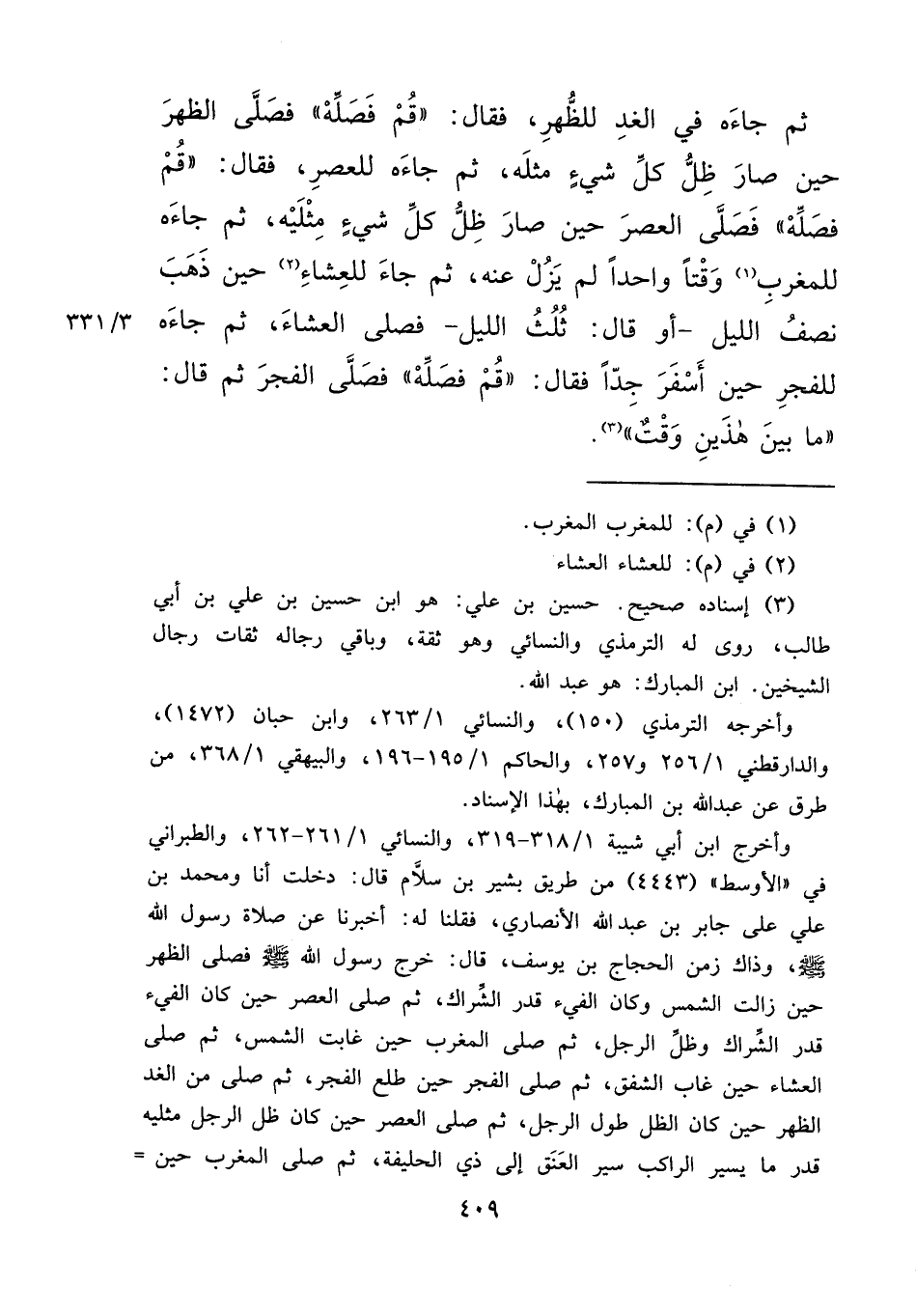 ثُمَّ جَاءَهُ مِنَ الْغَدِ لِلظُّهْرِ، فَقَالَ: قُمْ فَصَلِّهْ، فَصَلَّى الظُّهْرَ حِينَ صَارَ ظِلُّ كُلِّ شَيْءٍ مِثْلَهُ، ثُمَّ جَاءَهُ لِلْعَصْرِ، فَقَالَ: قُمْ فَصَلِّهْ، فَصَلَّى الْعَصْرَ حِينَ صَارَ ظِلُّ كُلِّ شَيْءٍ مِثْلَيْهِ، ثُمَّ جَاءَهُ لِلْمَغْرِبِ، (١) وَقْتًا وَاحِدًا لَمْ يَزُلْ عَنْهُ، ثُمَّ جَاءَ لِلْعِشَاءِ، (٢) حِينَ ذَهَبَ نِصْفُ اللَّيْلِ - أَوْ قَالَ: ثُلُثُ اللَّيْلِ - فَصَلَّى الْعِشَاءَ، ثُمَّ جَاءَهُ لِلْفَجْرِ حِينَ أَسْفَرَ جِدًّا، فَقَالَ: قُمْ فَصَلِّهْ، فَصَلَّى الْفَجْرَ، ثُمَّ قَالَ: مَا بَيْنَ هَذَيْنِ وَقْتٌ " (٣)