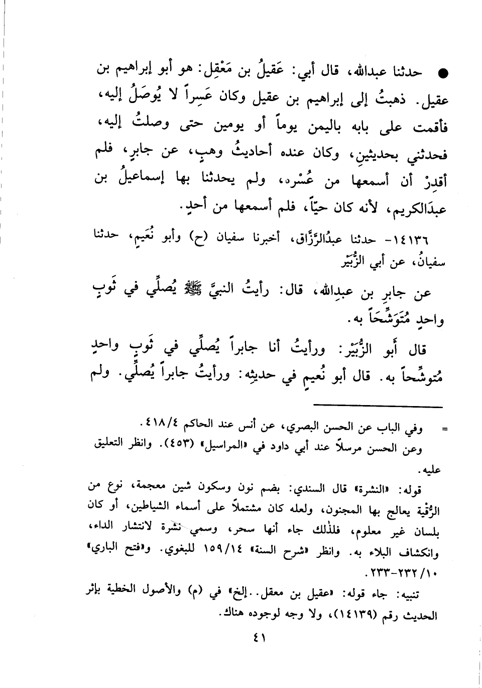 ١٤١٣٦ - حَدَّثَنَا عَبْدُ الرَّزَّاقِ، أَخْبَرَنَا سُفْيَانُ، ح وَأَبُو نُعَيْمٍ، حَدَّثَنَا سُفْيَانُ، عَنْ أَبِي الزُّبَيْرِ، عَنْ جَابِرِ بْنِ عَبْدِ اللهِ، قَالَ: " رَأَيْتُ النَّبِيَّ صَلَّى اللهُ عَلَيْهِ وَسَلَّمَ يُصَلِّي فِي ثَوْبٍ وَاحِدٍ مُتَوَشِّحًا بِهِ "، قَالَ أَبُو الزُّبَيْرِ: " وَرَأَيْتُ أَنَا جَابِرًا يُصَلِّي فِي ثَوْبٍ وَاحِدٍ مُتَوَشِّحًا بِهِ "، قَالَ أَبُو نُعَيْمٍ فِي حَدِيثِهِ: وَرَأَيْتُ جَابِرًا يُصَلِّي وَلَمْ