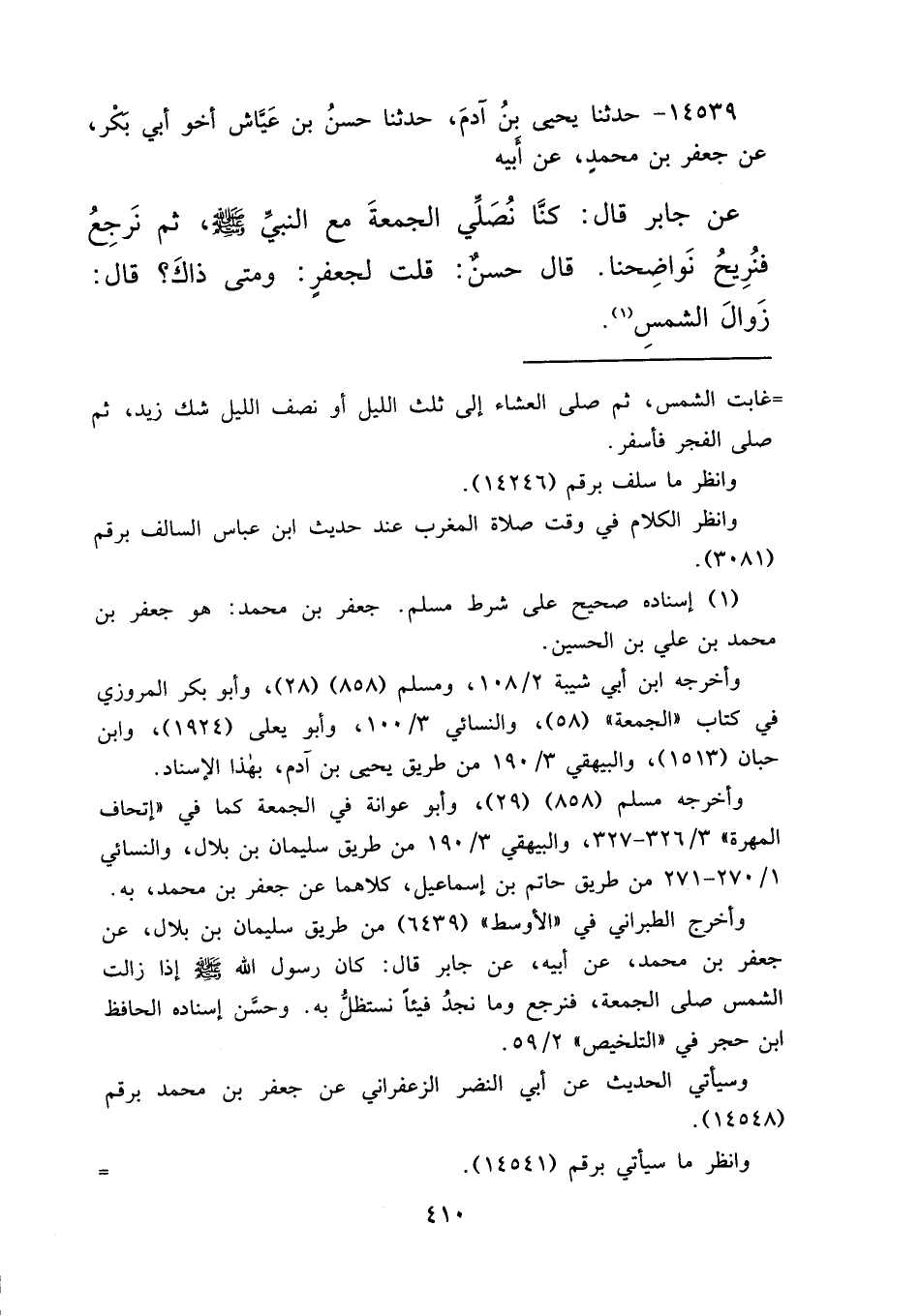 ١٤٥٣٩ - حَدَّثَنَا يَحْيَى بْنُ آدَمَ، حَدَّثَنَا حَسَنُ بْنُ عَيَّاشٍ، أَخُو أَبِي بَكْرٍ، عَنْ جَعْفَرِ بْنِ مُحَمَّدٍ، عَنْ أَبِيهِ، عَنْ جَابِرٍ، قَالَ: " كُنَّا نُصَلِّي الْجُمُعَةَ مَعَ النَّبِيِّ صَلَّى اللهُ عَلَيْهِ وَسَلَّمَ، ثُمَّ نَرْجِعُ فَنُرِيحُ نَوَاضِحَنَا "، قَالَ حَسَنٌ: قُلْتُ لِجَعْفَرٍ: وَمَتَى ذَاكَ؟ قَالَ: " زَوَالَ الشَّمْسِ " (١)
