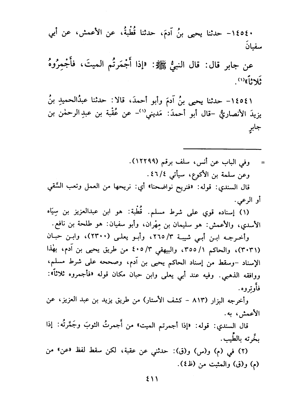 ١٤٥٤٠ - حَدَّثَنَا يَحْيَى بْنُ آدَمَ، حَدَّثَنَا قُطْبَةُ، عَنِ الْأَعْمَشِ، عَنْ أَبِي سُفْيَانَ، عَنْ جَابِرٍ، قَالَ: قَالَ النَّبِيُّ صَلَّى اللهُ عَلَيْهِ وَسَلَّمَ: " إِذَا أَجْمَرْتُمُ الْمَيِّتَ، فَأَجْمِرُوهُ ثَلَاثًا " (١)