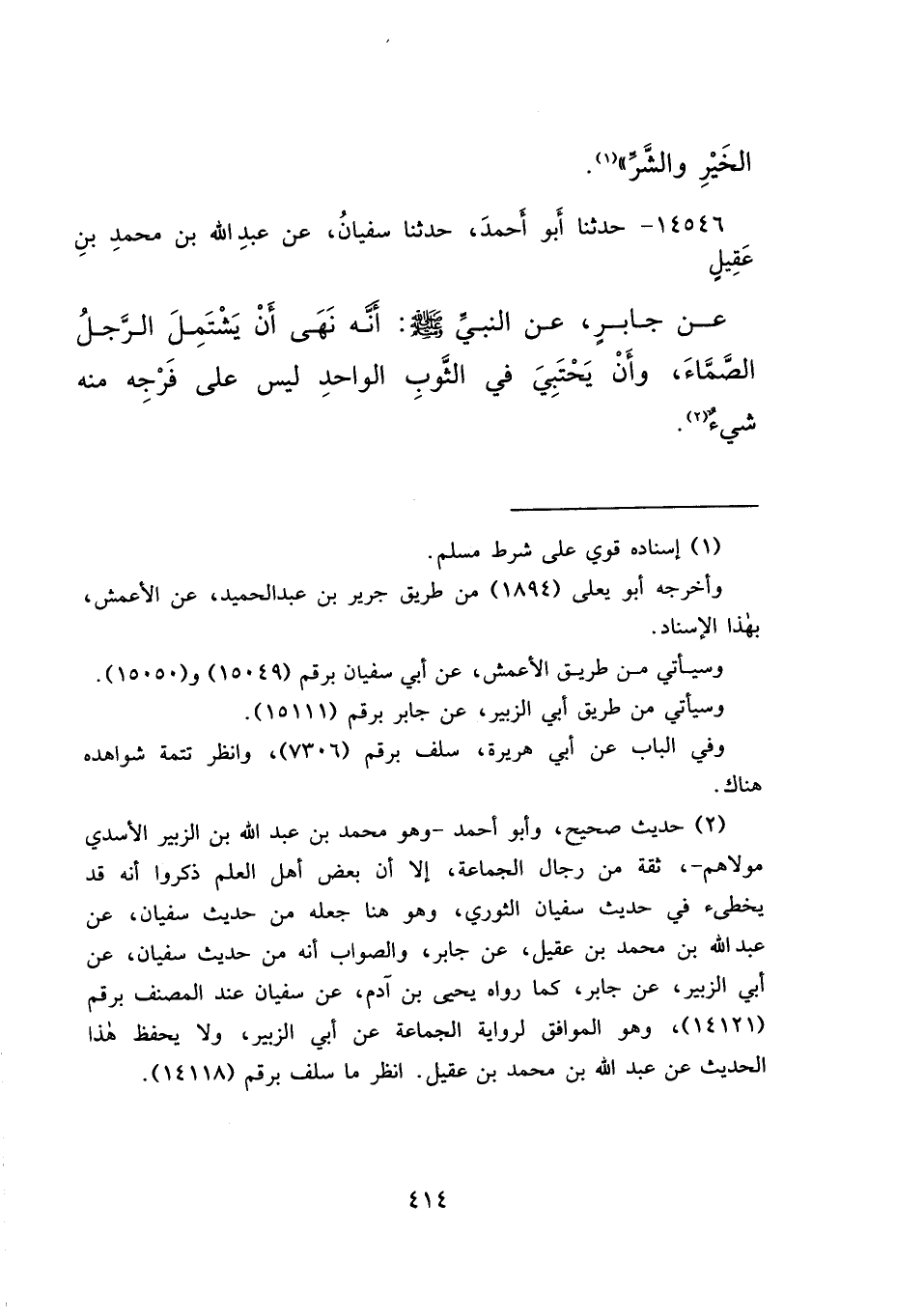 ١٤٥٤٦ - حَدَّثَنَا أَبُو أَحْمَدَ، حَدَّثَنَا سُفْيَانُ، عَنْ عَبْدِ اللهِ بْنِ مُحَمَّدِ بْنِ عَقِيلٍ، عَنْ جَابِرٍ، عَنِ النَّبِيِّ صَلَّى اللهُ عَلَيْهِ وَسَلَّمَ: " أَنَّهُ نَهَى أَنْ يَشْتَمِلَ الرَّجُلُ الصَّمَّاءَ، وَأَنْ يَحْتَبِيَ فِي الثَّوْبِ الْوَاحِدِ لَيْسَ عَلَى فَرْجِهِ مِنْهُ شَيْءٌ " (٢)
