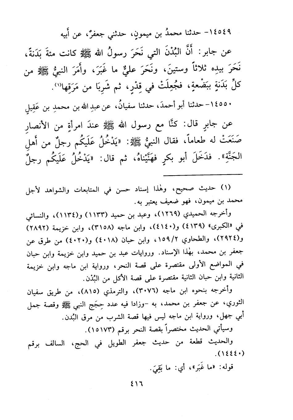 ١٤٥٤٩ - حَدَّثَنَا مُحَمَّدُ بْنُ مَيْمُونٍ، حَدَّثَنِي جَعْفَرٌ، عَنْ أَبِيهِ، عَنْ جَابِرٍ، " أَنَّ الْبُدْنَ الَّتِي نَحَرَ رَسُولُ اللهِ صَلَّى اللهُ عَلَيْهِ وَسَلَّمَ كَانَتْ مِائَةَ بَدَنَةٍ، نَحَرَ بِيَدِهِ ثَلَاثًا وَسِتِّينَ، وَنَحَرَ عَلِيٌّ مَا غَبَرَ، وَأَمَرَ النَّبِيُّ صَلَّى اللهُ عَلَيْهِ وَسَلَّمَ مِنْ كُلِّ بَدَنَةٍ بِبَضْعَةٍ، فَجُعِلَتْ فِي قِدْرٍ، ثُمَّ شَرِبَا مِنْ مَرَقِهَا (١) "