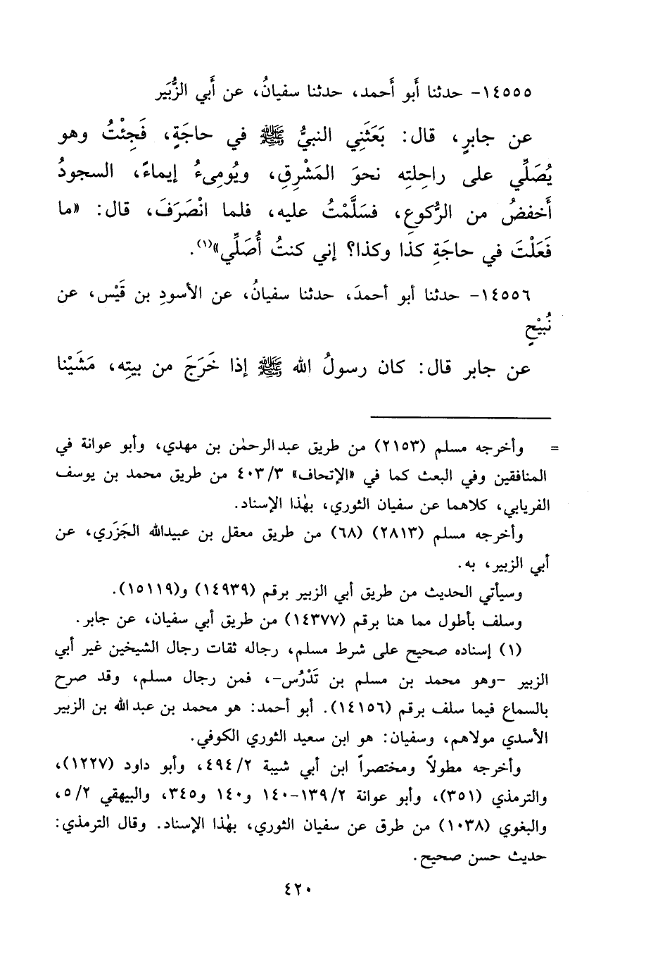 ١٤٥٥٥ - حَدَّثَنَا أَبُو أَحْمَدَ، حَدَّثَنَا سُفْيَانُ، عَنْ أَبِي الزُّبَيْرِ، عَنْ جَابِرٍ، قَالَ: بَعَثَنِي النَّبِيُّ صَلَّى اللهُ عَلَيْهِ وَسَلَّمَ فِي حَاجَةٍ، فَجِئْتُ وَهُوَ يُصَلِّي عَلَى رَاحِلَتِهِ نَحْوَ الْمَشْرِقِ، وَيُومِئُ إِيمَاءً، السُّجُودُ أَخْفَضُ مِنَ الرُّكُوعِ، فَسَلَّمْتُ عَلَيْهِ، فَلَمَّا انْصَرَفَ، قَالَ: " مَا فَعَلْتَ فِي حَاجَةِ كَذَا وَكَذَا؟ إِنِّي كُنْتُ أُصَلِّي " (١)