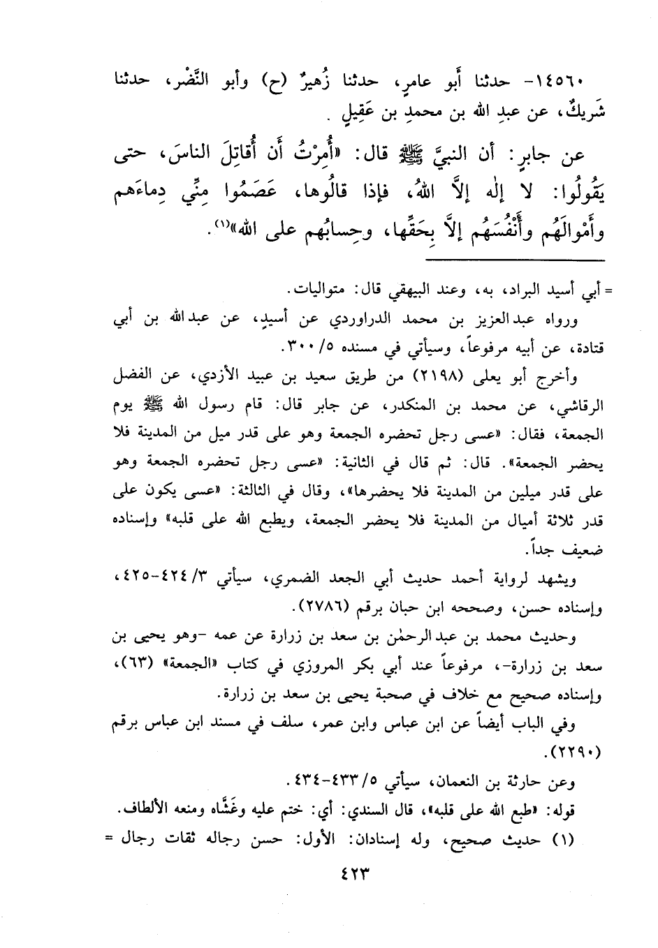 ١٤٥٦٠ - حَدَّثَنَا أَبُو عَامِرٍ، حَدَّثَنَا زُهَيْرٌ، ح وَأَبُو النَّضْرِ، حَدَّثَنَا شَرِيكٌ، عَنْ عَبْدِ اللهِ بْنِ مُحَمَّدِ بْنِ عَقِيلٍ، عَنْ جَابِرٍ، أَنَّ النَّبِيَّ صَلَّى اللهُ عَلَيْهِ وَسَلَّمَ قَالَ: " أُمِرْتُ أَنْ أُقَاتِلَ النَّاسَ حَتَّى يَقُولُوا: لَا إِلَهَ إِلَّا اللهُ، فَإِذَا قَالَوهَا، عَصَمُوا مِنِّي دِمَاءَهُمْ وَأَمْوَالَهُمْ وَأَنْفُسَهُمْ، إِلَّا بِحَقِّهَا، وَحِسَابُهُمْ عَلَى اللهِ " (١)