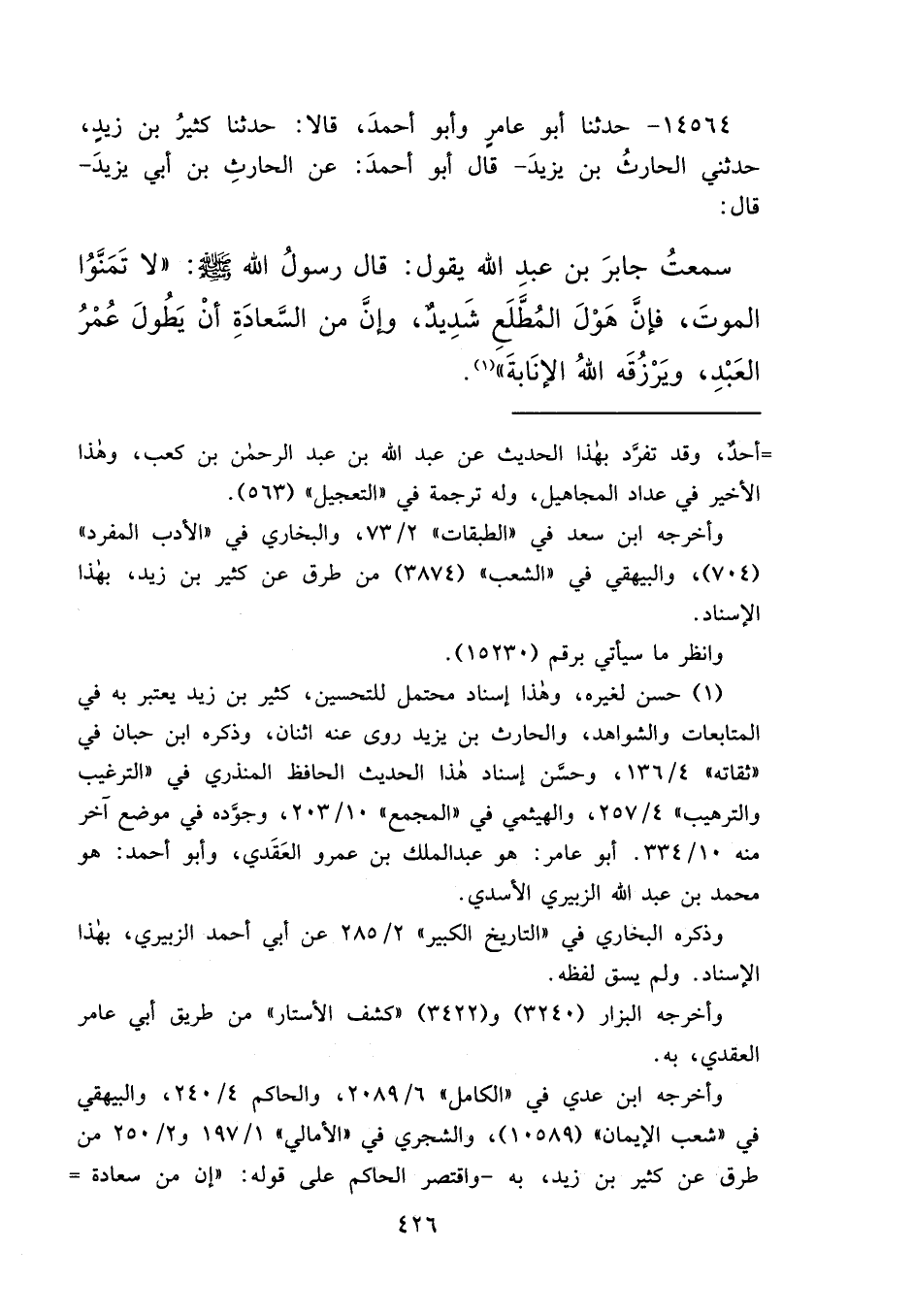 ١٤٥٦٤ - حَدَّثَنَا أَبُو عَامِرٍ، وَأَبُو أَحْمَدَ، قَالَا: حَدَّثَنَا كَثِيرُ بْنُ زَيْدٍ، حَدَّثَنِي الْحَارِثُ بْنُ يَزِيدَ، قَالَ أَبُو أَحْمَدَ: عَنِ الْحَارِثِ بْنِ أَبِي يَزِيدَ، قَالَ: سَمِعْتُ جَابِرَ بْنَ عَبْدِ اللهِ، يَقُولُ: قَالَ رَسُولُ اللهِ صَلَّى اللهُ عَلَيْهِ وَسَلَّمَ: " لَا تَمَنَّوْا الْمَوْتَ، فَإِنَّ هَوْلَ الْمَطْلَعِ شَدِيدٌ، وَإِنَّ مِنَ السَّعَادَةِ أَنْ يَطُولَ عُمْرُ الْعَبْدِ، وَيَرْزُقَهُ اللهُ الْإِنَابَةَ " (١)