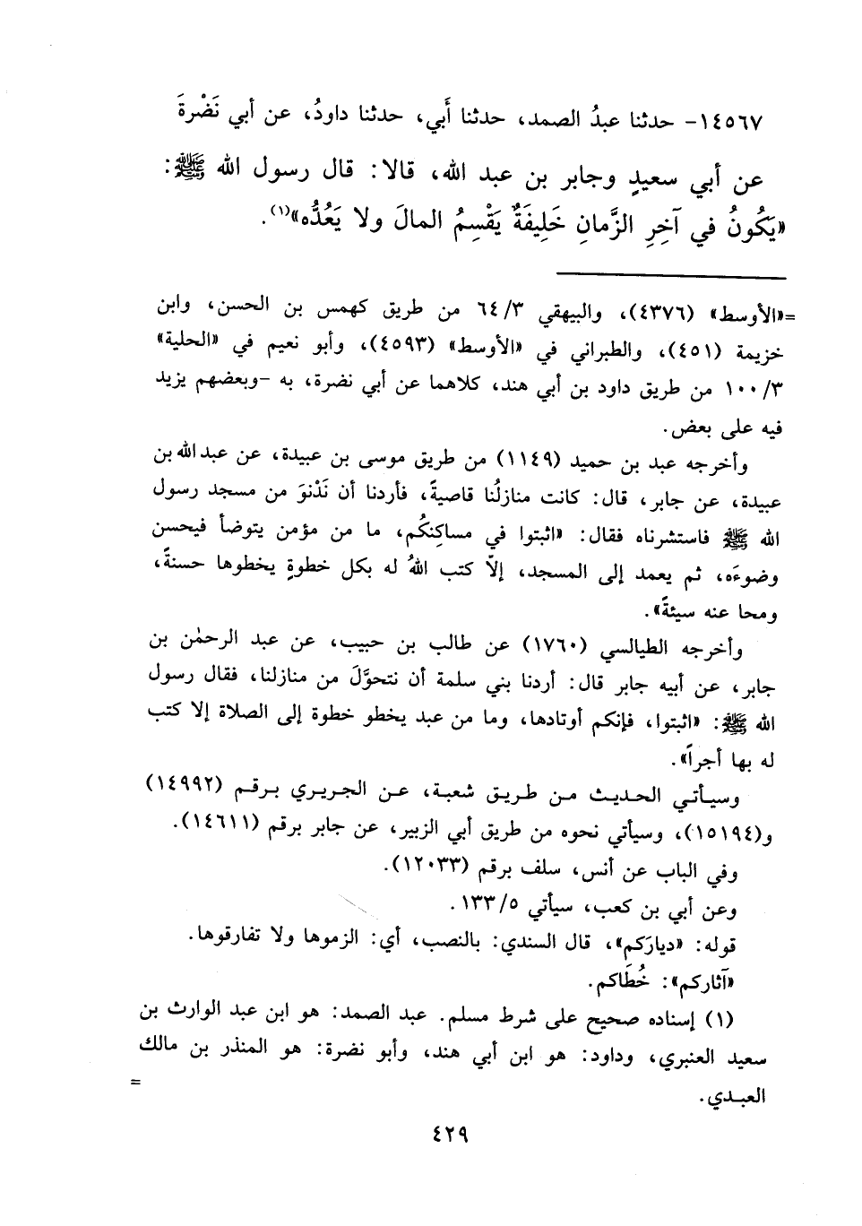 ١٤٥٦٧ - حَدَّثَنَا عَبْدُ الصَّمَدِ، حَدَّثَنَا أَبِي، حَدَّثَنَا دَاوُدُ، عَنْ أَبِي نَضْرَةَ، عَنْ أَبِي سَعِيدٍ، وَجَابِرِ بْنِ عَبْدِ اللهِ، قَالَا: قَالَ رَسُولُ اللهِ صَلَّى اللهُ عَلَيْهِ وَسَلَّمَ: " يَكُونُ فِي آخِرِ الزَّمَانِ خَلِيفَةٌ يَقْسِمُ الْمَالَ، وَلَا يَعُدُّهُ " (١)