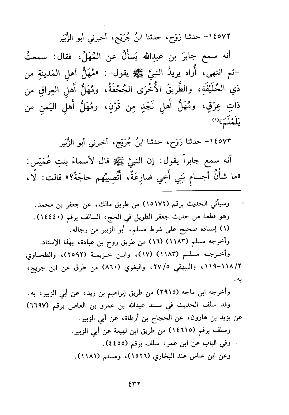 ١٤٥٧٢ - حَدَّثَنَا رَوْحٌ، حَدَّثَنَا ابْنُ جُرَيْجٍ، أَخْبَرَنِي أَبُو الزُّبَيْرِ، أَنَّهُ سَمِعَ جَابِرَ بْنَ عَبْدِ اللهِ، يُسْأَلُ عَنِ الْمُهَلِّ، فَقَالَ: سَمِعْتُ - ثُمَّ انْتَهَى، أُرَاهُ يُرِيدُ النَّبِيَّ صَلَّى اللهُ عَلَيْهِ وَسَلَّمَ يَقُولُ -: " مُهَلُّ أَهْلِ الْمَدِينَةِ مِنْ ذِي الْحُلَيْفَةِ، وَالطَّرِيقِ الْأُخْرَى الْجُحْفَةِ، وَمُهَلُّ أَهْلِ الْعِرَاقِ مِنْ ذَاتِ عِرْقٍ، وَمُهَلُّ أَهْلِ نَجْدٍ مِنْ قَرْنٍ، وَمُهَلُّ أَهْلِ الْيَمَنِ مِنْ يَلَمْلَمَ " (١)