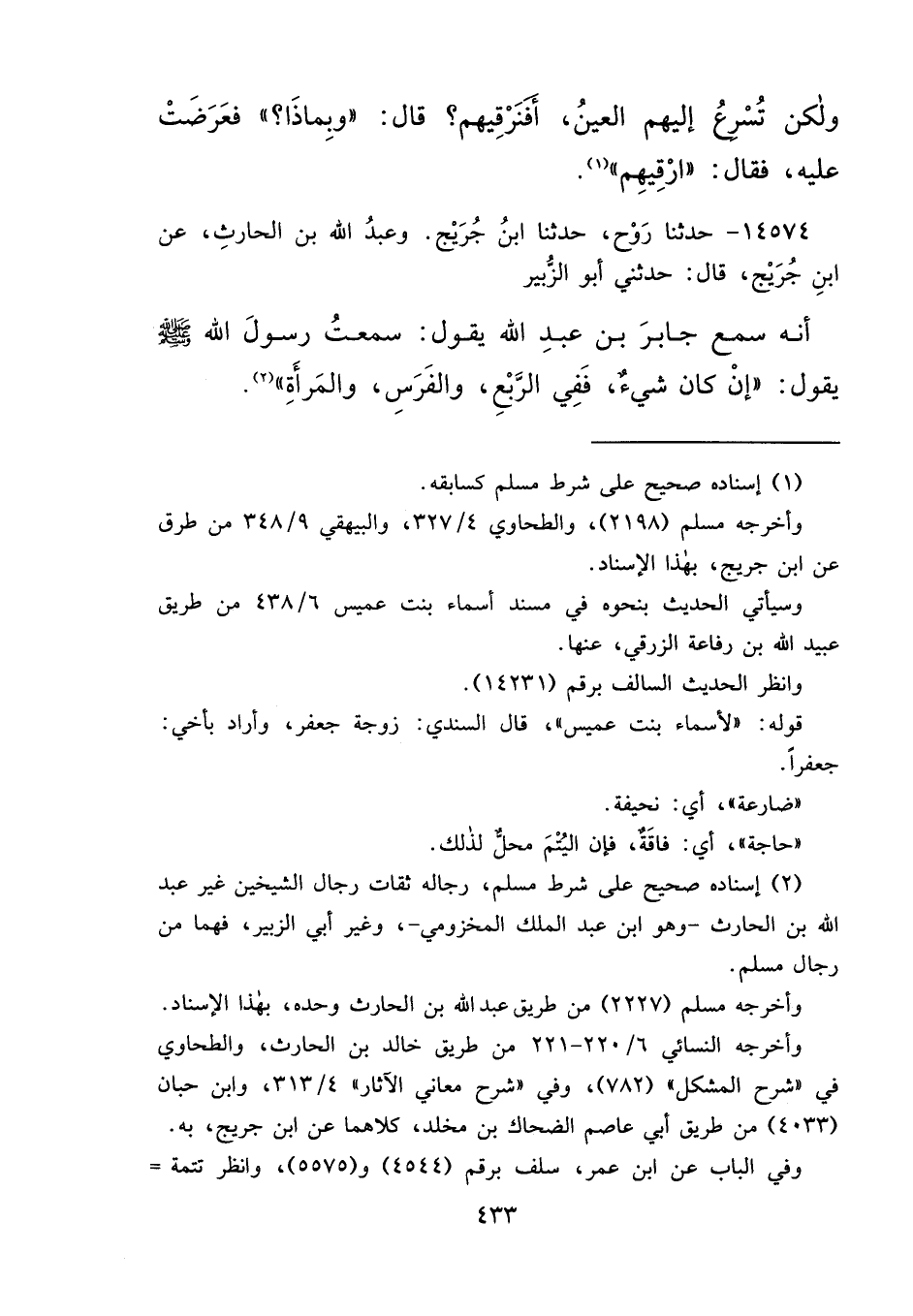 ١٤٥٧٤ - حَدَّثَنَا رَوْحٌ، حَدَّثَنَا ابْنُ جُرَيْجٍ، وَعَبْدُ اللهِ بْنُ الْحَارِثِ، عَنِ ابْنِ جُرَيْجٍ، قَالَ: حَدَّثَنِي أَبُو الزُّبَيْرِ، أَنَّهُ سَمِعَ جَابِرَ بْنَ عَبْدِ اللهِ، يَقُولُ: سَمِعْتُ رَسُولَ اللهِ صَلَّى اللهُ عَلَيْهِ وَسَلَّمَ يَقُولُ: " إِنْ كَانَ شَيْءٌ فَفِي الرَّبْعِ، وَالْفَرَسِ، وَالْمَرْأَةِ " (٢)