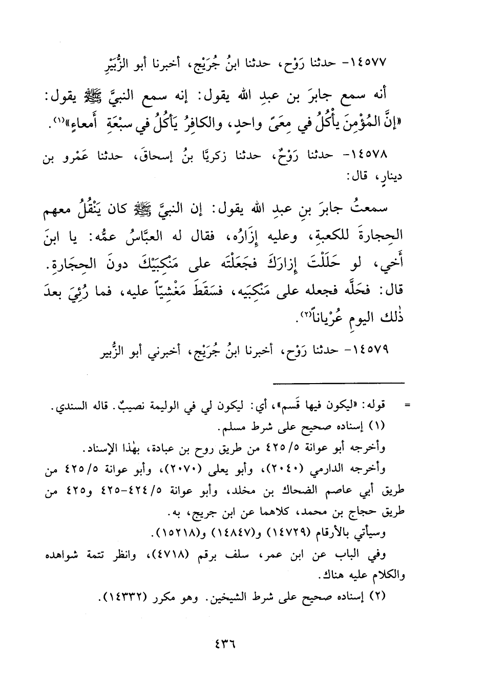 ١٤٥٧٧ - حَدَّثَنَا رَوْحٌ، حَدَّثَنَا ابْنُ جُرَيْجٍ، أَخْبَرَنَا أَبُو الزُّبَيْرِ، أَنَّهُ سَمِعَ جَابِرَ بْنَ عَبْدِ اللهِ، يَقُولُ: إِنَّهُ سَمِعَ النَّبِيَّ صَلَّى اللهُ عَلَيْهِ وَسَلَّمَ يَقُولُ: " إِنَّ الْمُؤْمِنَ يَأْكُلُ فِي مِعًى وَاحِدٍ، وَالْكَافِرُ يَأْكُلُ فِي سَبْعَةِ أَمْعَاءٍ " (١)