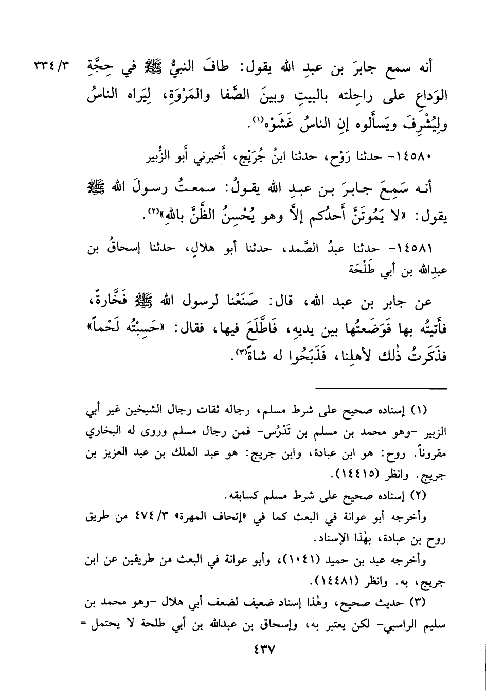 ١٤٥٨٠ - حَدَّثَنَا رَوْحٌ، حَدَّثَنَا ابْنُ جُرَيْجٍ، أَخْبَرَنِي أَبُو الزُّبَيْرِ، أَنَّهُ سَمِعَ جَابِرَ بْنَ عَبْدِ اللهِ، يَقُولُ: سَمِعْتُ رَسُولَ اللهِ صَلَّى اللهُ عَلَيْهِ وَسَلَّمَ يَقُولُ: " لَا يَمُوتَنَّ أَحَدُكُمْ إِلَّا وَهُوَ يُحْسِنُ الظَّنَّ بِاللهِ " (٢)
