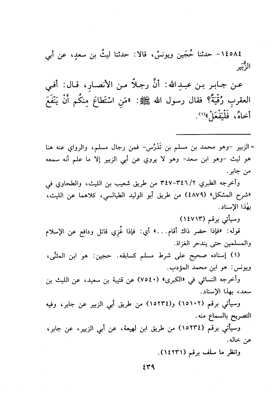 ١٤٥٨٤ - حَدَّثَنَا حُجَيْنٌ، وَيُونُسُ، قَالَا: حَدَّثَنَا لَيْثُ بْنُ سَعْدٍ، عَنْ أَبِي الزُّبَيْرِ، عَنْ جَابِرِ بْنِ عَبْدِ اللهِ، أَنَّ رَجُلًا مِنَ الْأَنْصَارِ قَالَ: أَفِي الْعَقْرَبِ رُقْيَةٌ؟ فَقَالَ رَسُولُ اللهِ صَلَّى اللهُ عَلَيْهِ وَسَلَّمَ: " مَنْ اسْتَطَاعَ مِنْكُمْ أَنْ يَنْفَعَ أَخَاهُ فَلْيَفْعَلْ " (١)
