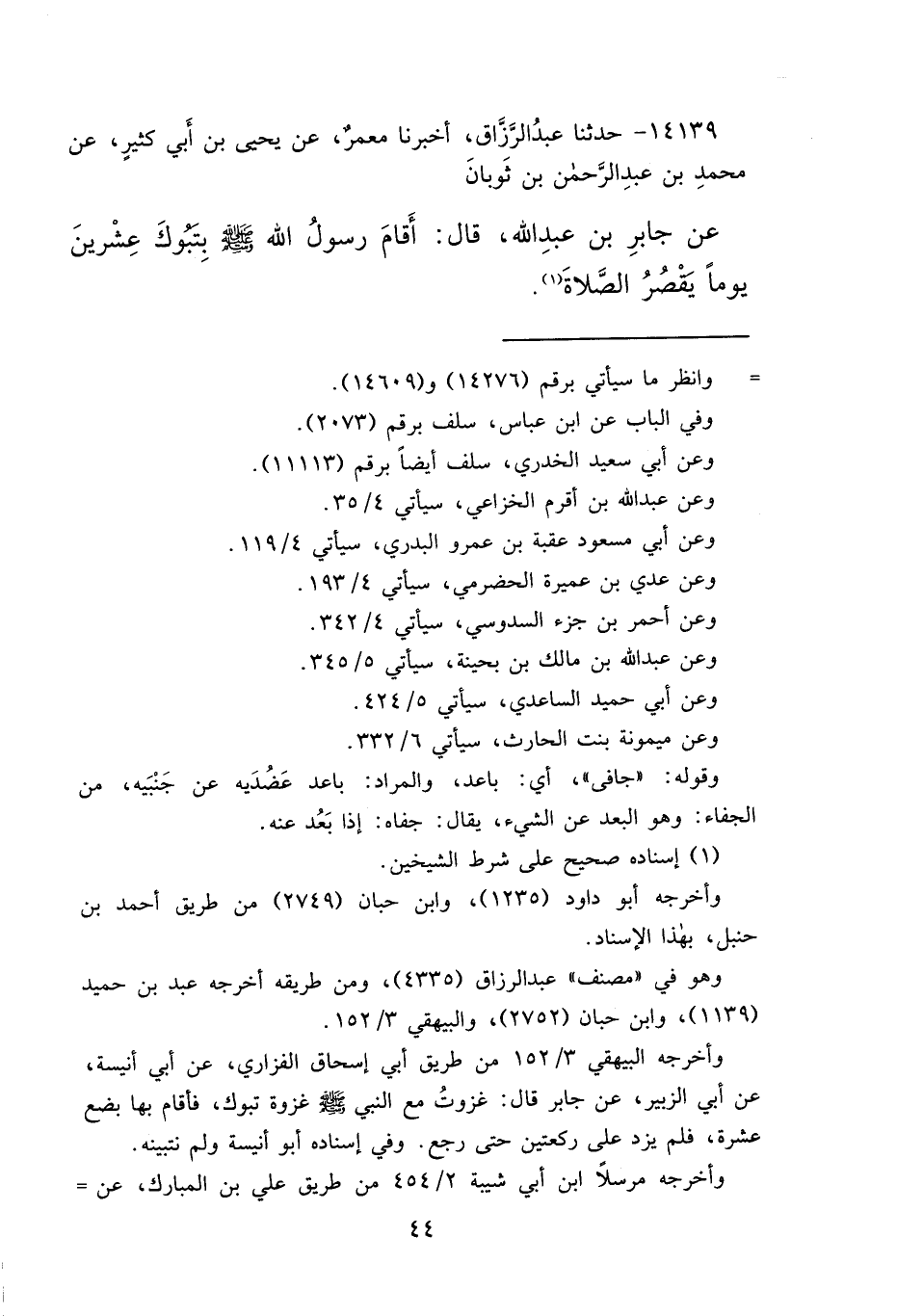 ١٤١٣٩ - حَدَّثَنَا عَبْدُ الرَّزَّاقِ، أَخْبَرَنَا مَعْمَرٌ، عَنْ يَحْيَى بْنِ أَبِي كَثِيرٍ، عَنْ مُحَمَّدِ بْنِ عَبْدِ الرَّحْمَنِ بْنِ ثَوْبَانَ، عَنْ جَابِرِ بْنِ عَبْدِ اللهِ، قَالَ: " أَقَامَ رَسُولُ اللهِ صَلَّى اللهُ عَلَيْهِ وَسَلَّمَ بِتَبُوكَ عِشْرِينَ يَوْمًا يَقْصُرُ الصَّلَاةَ " (١)