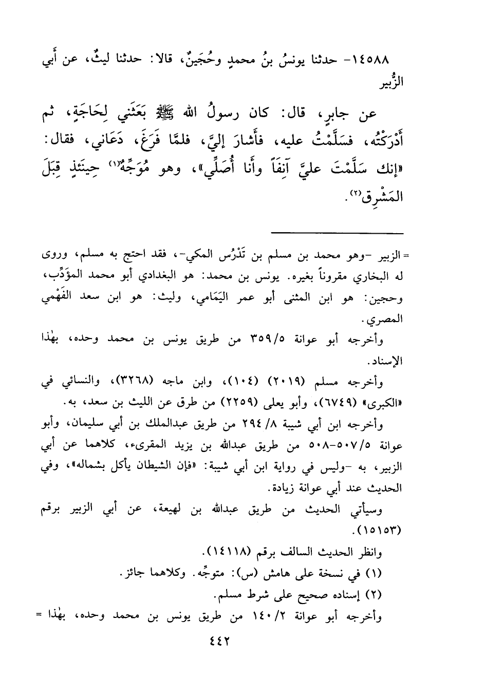 ١٤٥٨٨ - حَدَّثَنَا يُونُسُ بْنُ مُحَمَّدٍ، وَحُجَيْنٌ، قَالَا: حَدَّثَنَا لَيْثٌ، عَنْ أَبِي الزُّبَيْرِ، عَنْ جَابِرٍ، قَالَ: كَانَ رَسُولُ اللهِ صَلَّى اللهُ عَلَيْهِ وَسَلَّمَ بَعَثَنِي لِحَاجَةٍ، ثُمَّ أَدْرَكْتُهُ، فَسَلَّمْتُ عَلَيْهِ، فَأَشَارَ إِلَيَّ، فَلَمَّا فَرَغَ دَعَانِي، فَقَالَ: " إِنَّكَ سَلَّمْتَ عَلَيَّ آنِفًا، وَأَنَا أُصَلِّي "، وَهُوَ مُوَجِّهٌ (١) حِينَئِذٍ قِبَلَ الْمَشْرِقِ (٢)