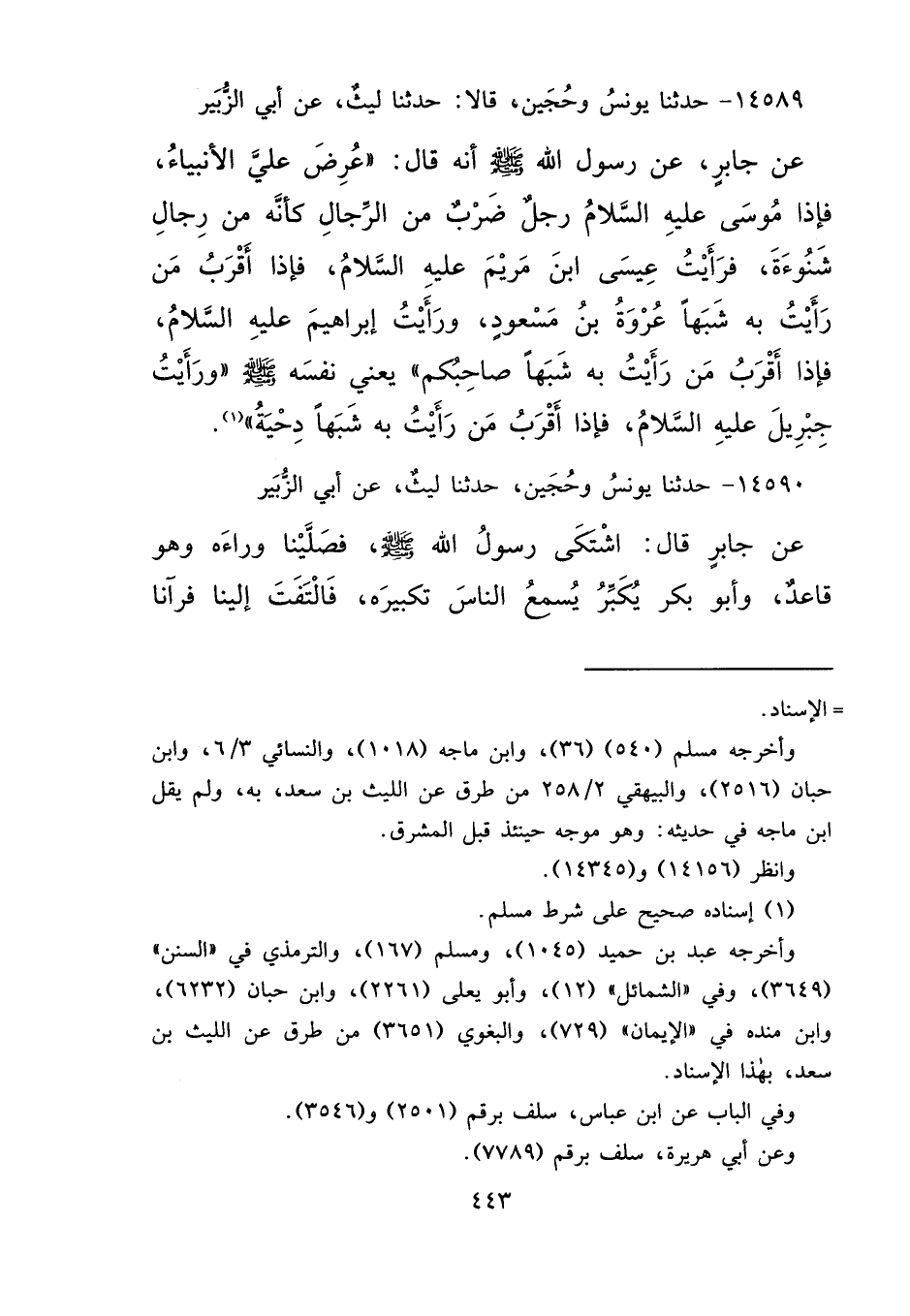١٤٥٨٩ - حَدَّثَنَا يُونُسُ، وَحُجَيْنٌ، قَالَا: حَدَّثَنَا لَيْثٌ، عَنْ أَبِي الزُّبَيْرِ، عَنْ جَابِرٍ، عَنْ رَسُولِ اللهِ صَلَّى اللهُ عَلَيْهِ وَسَلَّمَ، أَنَّهُ قَالَ: " عُرِضَ عَلَيَّ الْأَنْبِيَاءُ، فَإِذَا مُوسَى عَلَيْهِ السَّلَامُ رَجُلٌ ضَرْبٌ مِنَ الرِّجَالِ، كَأَنَّهُ مِنْ رِجَالِ شَنُوءَةَ، فَرَأَيْتُ عِيسَى ابْنَ مَرْيَمَ عَلَيْهِ السَّلَامُ، فَإِذَا أَقْرَبُ مَنْ رَأَيْتُ بِهِ شَبَهًا عُرْوَةُ بْنُ مَسْعُودٍ، وَرَأَيْتُ إِبْرَاهِيمَ عَلَيْهِ السَّلَامُ، فَإِذَا أَقْرَبُ مَنْ رَأَيْتُ بِهِ شَبَهًا صَاحِبُكُمْ - يَعْنِي نَفْسَهُ صَلَّى اللهُ عَلَيْهِ وَسَلَّمَ -، وَرَأَيْتُ جِبْرِيلَ عَلَيْهِ السَّلَامُ، فَإِذَا أَقْرَبُ مَنْ رَأَيْتُ بِهِ شَبَهًا دِحْيَةُ " (١)