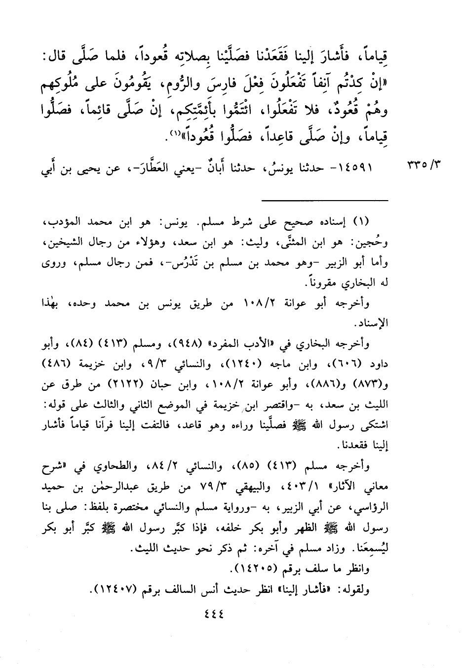 وأخرجه البخاري في "الأدب المفرد" (٩٤٨) ، ومسلم (٤١٣) (٨٤) ، وأبو داود (٦٠٦) ، وابن ماجه (١٢٤٠) ، والنسائي ٣/٩، وابن خزيمة (٤٨٦) و (٨٧٣) و (٨٨٦) ، وأبو عوانة ٢/١٠٨، وابن حبان (٢١٢٢) من طرق عن الليث بن سعد، به- واقتصر ابن- خزيمة في الموضع الثاني والثالث على قوله: اشتكى رسول الله صَلَّى اللهُ عَلَيْهِ وَسَلَّمَ فصلَّينا وراءه وهو قاعد، فالتفت إلينا فرآنا قياماً فأشار إلينا فقعدنا.