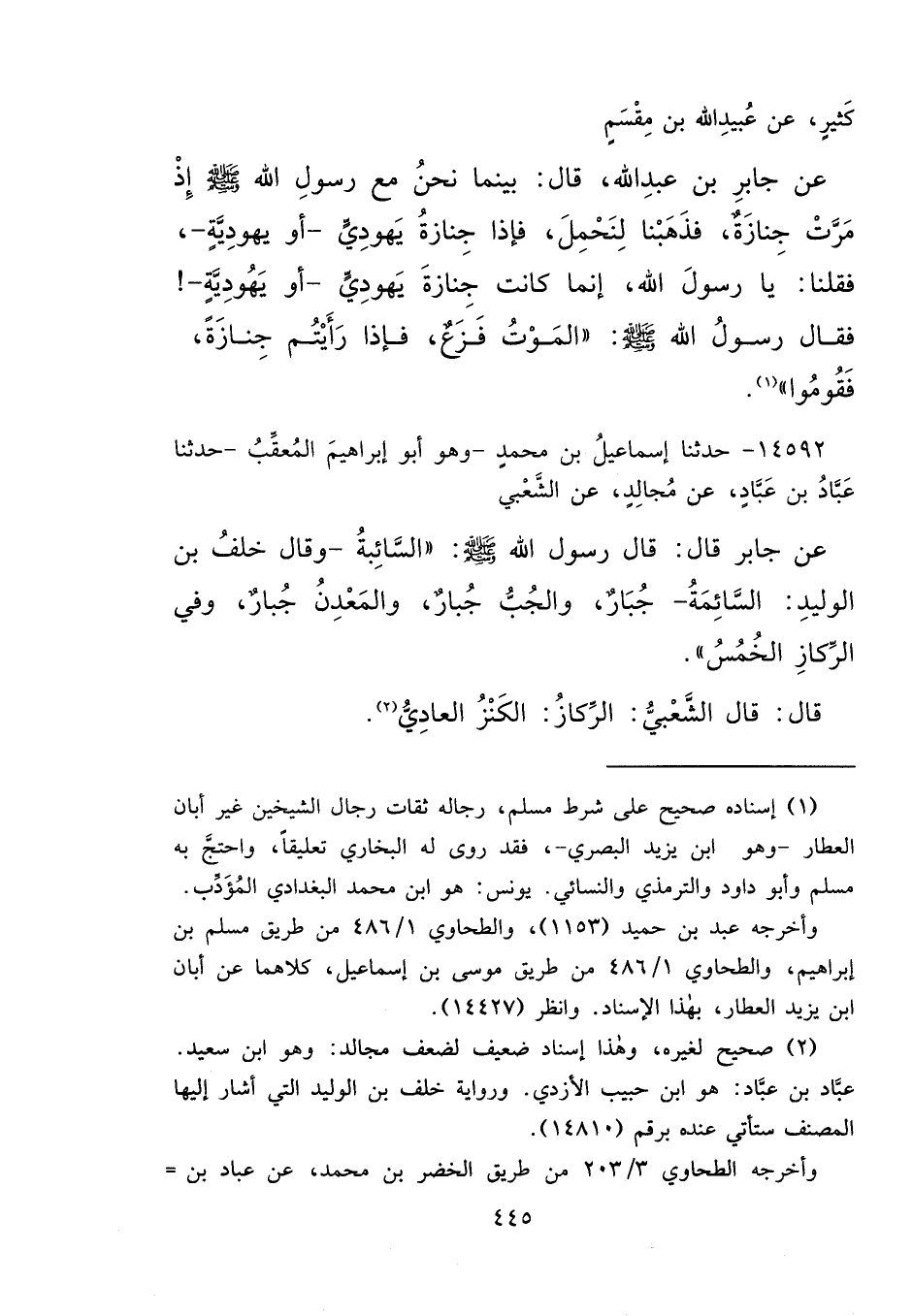 ١٤٥٩٢ - حَدَّثَنَا إِسْمَاعِيلُ بْنُ مُحَمَّدٍ وَهُوَ أَبُو إِبْرَاهِيمَ الْمُعَقِّبُ، حَدَّثَنَا عَبَّادُ بْنُ عَبَّادٍ، عَنْ مُجَالِدٍ، عَنِ الشَّعْبِيِّ، عَنْ جَابِرٍ، قَالَ: قَالَ رَسُولُ اللهِ صَلَّى اللهُ عَلَيْهِ وَسَلَّمَ: " السَّائِبَةُ، وقَالَ خَلَفُ بْنُ الْوَلِيدِ: " السَّائِمَةُ - جُبَارٌ، وَالْجُبُّ جُبَارٌ، وَالْمَعْدِنُ جُبَارٌ، وَفِي الرِّكَازِ الْخُمُسُ "، قَالَ: قَالَ الشَّعْبِيُّ: " الرِّكَازُ: الْكَنْزُ الْعَادِي " (٢)