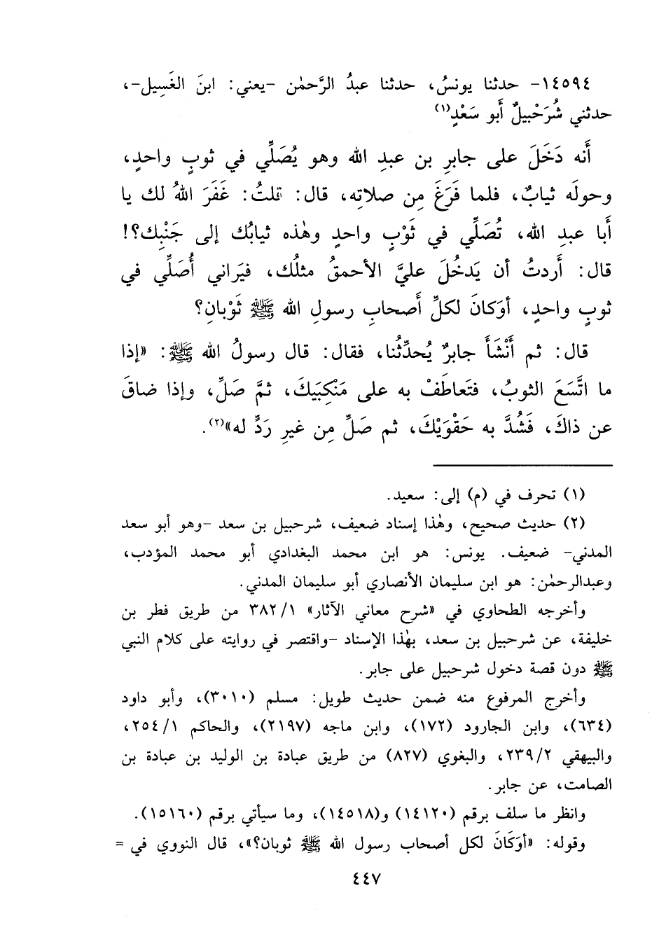 ١٤٥٩٤ - حَدَّثَنَا يُونُسُ، حَدَّثَنَا عَبْدُ الرَّحْمَنِ يَعْنِي ابْنَ الْغَسِيلِ، حَدَّثَنِي شُرَحْبِيلُ أَبُو سَعْدٍ، (١) أَنَّهُ دَخَلَ عَلَى جَابِرِ بْنِ عَبْدِ اللهِ، وَهُوَ يُصَلِّي فِي ثَوْبٍ وَاحِدٍ، وَحَوْلَهُ ثِيَابٌ، فَلَمَّا فَرَغَ مِنْ صَلَاتِهِ، قَالَ: قُلْتُ: غَفَرَ اللهُ لَكَ يَا أَبَا عَبْدِ اللهِ، تُصَلِّي فِي ثَوْبٍ وَاحِدٍ، وَهَذِهِ ثِيَابُكَ إِلَى جَنْبِكَ، قَالَ: أَرَدْتُ أَنْ يَدْخُلَ عَلَيَّ الْأَحْمَقُ مِثْلُكَ فَيَرَانِي أُصَلِّي فِي ثَوْبٍ وَاحِدٍ، أَوَكَانَ لِكُلِّ أَصْحَابِ رَسُولِ اللهِ صَلَّى اللهُ عَلَيْهِ وَسَلَّمَ ثَوْبَانِ؟ قَالَ: ثُمَّ أَنْشَأَ جَابِرٌ يُحَدِّثُنَا، فَقَالَ: قَالَ رَسُولُ اللهِ صَلَّى اللهُ عَلَيْهِ وَسَلَّمَ: " إِذَا مَا اتَّسَعَ الثَّوْبُ، فَتَعَاطَفْ بِهِ عَلَى مَنْكِبَيْكَ، ثُمَّ صَلِّ، وَإِذَا ضَاقَ عَنْ ذَاكَ، فَشُدَّ بِهِ حَقْوَيْكَ، ثُمَّ صَلِّ مِنْ غَيْرِ رِدٍّ لَهُ " (٢)