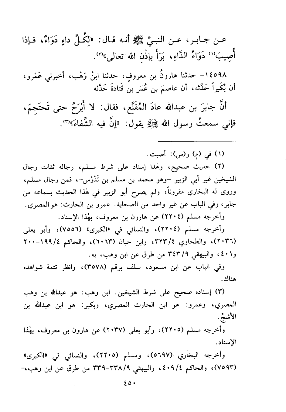 (٢) حديث صحيح، وهذا إسناد على شرط مسلم، رجاله ثقات رجال الشيخين غير أبي الزبير- وهو محمد بن مسلم بن تَدْرُس-، فمن رجال مسلم، وروى له البخاري مقروناً، ولم يصرح أبو الزبير في هذا الحديث بسماعه من جابر، وفي الباب عن غير واحد من الصحابة. عمرو بن الحارث: هو المصري.