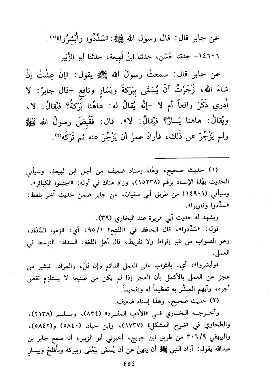 ١٤٦٠٦ - حَدَّثَنَا حَسَنٌ، حَدَّثَنَا ابْنُ لَهِيعَةَ، حَدَّثَنَا أَبُو الزُّبَيْرِ، عَنْ جَابِرٍ، قَالَ: سَمِعْتُ رَسُولَ اللهِ صَلَّى اللهُ عَلَيْهِ وَسَلَّمَ يَقُولُ: " إِنْ عِشْتُ إِنْ شَاءَ اللهُ، زَجَرْتُ أَنْ يُسَمَّى: بَرَكَةُ، وَيَسَارٌ، وَنَافِعٍ - قَالَ جَابِرٌ: لَا أَدْرِي، ذَكَرَ رَافِعًا أَمْ لَا - إِنَّهُ يُقَالَ لَهُ: هَاهُنَا بَرَكَةٌ؟ فَيُقَالَ: لَا، وَيُقَالَ: هَاهُنَا يَسَارٌ، فَيُقَالَ: لَا "، قَالَ: فَقُبِضَ رَسُولُ اللهِ صَلَّى اللهُ عَلَيْهِ وَسَلَّمَ، وَلَمْ يَزْجُرْ عَنْ ذَلِكَ، " فَأَرَادَ عُمَرُ أَنْ يَزْجُرَ عَنْهُ، ثُمَّ تَرَكَهُ " (٢)