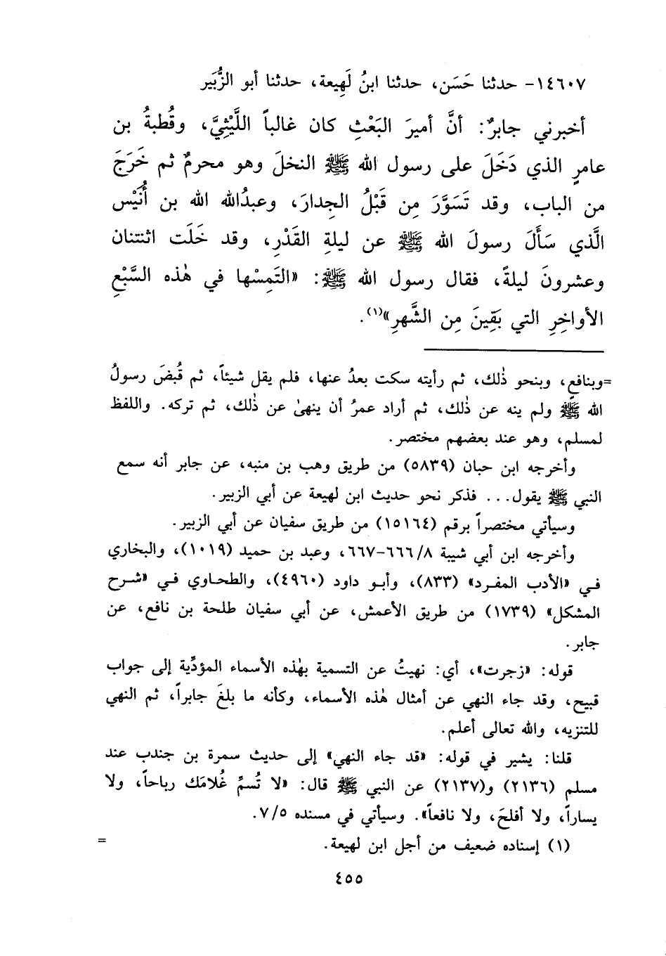 ١٤٦٠٧ - حَدَّثَنَا حَسَنٌ، حَدَّثَنَا ابْنُ لَهِيعَةَ، حَدَّثَنَا أَبُو الزُّبَيْرِ، أَخْبَرَنِي جَابِرٌ، أَنَّ أَمِيرَ الْبَعْثِ كَانَ غَالِبًا اللَّيْثِيَّ، وَقُطْبَةَ بْنَ عَامِرٍ الَّذِي دَخَلَ عَلَى رَسُولِ اللهِ صَلَّى اللهُ عَلَيْهِ وَسَلَّمَ النَّخْلَ وَهُوَ مُحْرِمٌ، ثُمَّ خَرَجَ مِنَ الْبَابِ، وَقَدْ تَسَوَّرَ مِنْ قِبَلِ الْجِدَارِ، وَعَبْدُ اللهِ بْنُ أُنَيْسٍ الَّذِي سَأَلَ رَسُولَ اللهِ صَلَّى اللهُ عَلَيْهِ وَسَلَّمَ عَنْ لَيْلَةِ الْقَدْرِ، وَقَدْ خَلَتْ اثْنَتَانِ وَعِشْرُونَ لَيْلَةً، فَقَالَ رَسُولُ اللهِ صَلَّى اللهُ عَلَيْهِ وَسَلَّمَ: " الْتَمِسْهَا فِي هَذِهِ السَّبْعِ الْأَوَاخِرِ الَّتِي بَقِينَ مِنَ الشَّهْرِ " (١)