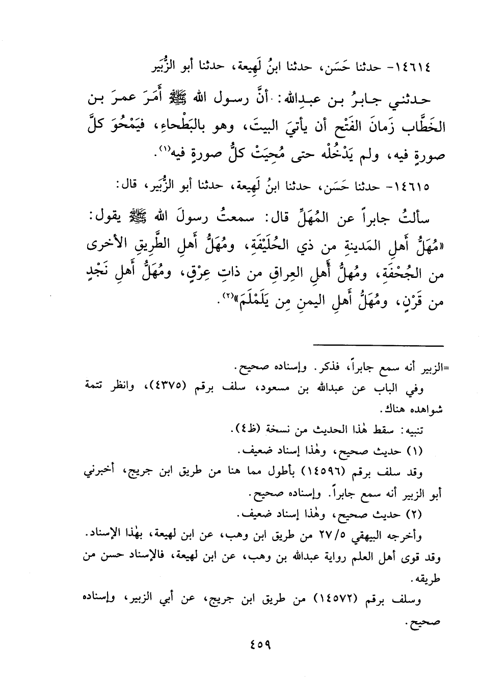 ١٤٦١٥ - حَدَّثَنَا حَسَنٌ، حَدَّثَنَا ابْنُ لَهِيعَةَ، حَدَّثَنَا أَبُو الزُّبَيْرِ قَالَ: سَأَلْتُ جَابِرًا، عَنِ الْمُهَلِّ؟ قَالَ: سَمِعْتُ رَسُولَ اللهِ صَلَّى اللهُ عَلَيْهِ وَسَلَّمَ يَقُولُ: " مُهَلُّ أَهْلِ الْمَدِينَةِ مِنْ ذِي الْحُلَيْفَةِ، وَمُهَلُّ أَهْلِ الطَّرِيقِ الْأُخْرَى مِنَ الْجُحْفَةِ، وَمُهَلُّ أَهْلِ الْعِرَاقِ مِنْ ذَاتِ عِرْقٍ، وَمُهَلُّ أَهْلِ نَجْدٍ مِنْ قَرْنٍ، وَمُهَلُّ أَهْلِ الْيَمَنِ مِنْ يَلَمْلَمَ " (٢)