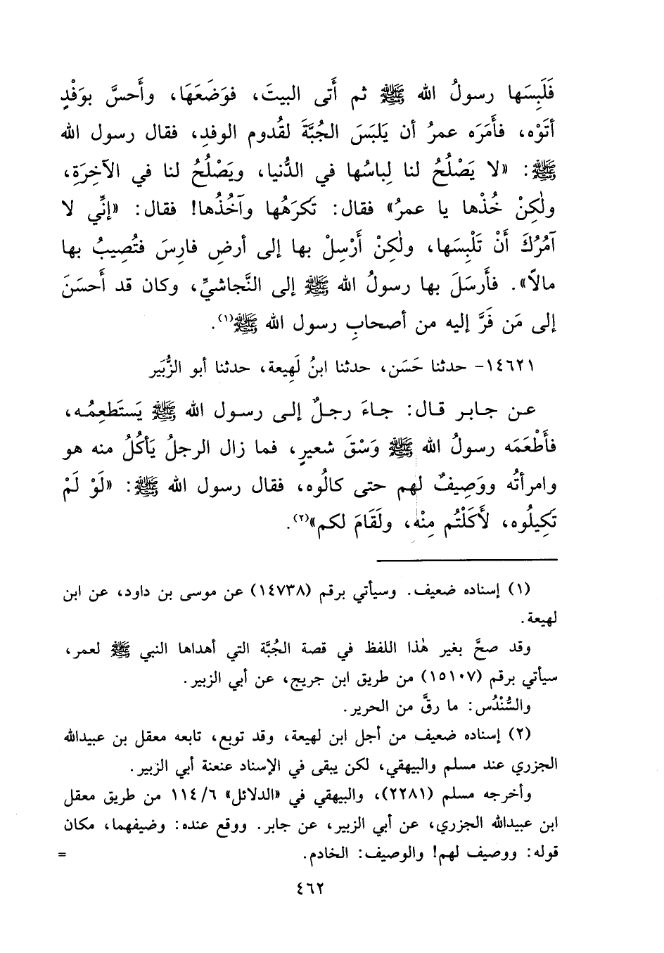 ١٤٦٢١ - حَدَّثَنَا حَسَنٌ، حَدَّثَنَا ابْنُ لَهِيعَةَ، حَدَّثَنَا أَبُو الزُّبَيْرِ، عَنْ جَابِرٍ، قَالَ: جَاءَ رَجُلٌ إِلَى رَسُولِ اللهِ صَلَّى اللهُ عَلَيْهِ وَسَلَّمَ يَسْتَطْعِمُهُ، فَأَطْعَمَهُ رَسُولُ اللهِ صَلَّى اللهُ عَلَيْهِ وَسَلَّمَ وَسْقَ شَعِيرٍ، فَمَا زَالَ الرَّجُلُ يَأْكُلُ مِنْهُ هُوَ وَامْرَأَتُهُ وَوَصِيفٌ لَهُمْ حَتَّى كَالُوهُ، فَقَالَ رَسُولُ اللهِ صَلَّى اللهُ عَلَيْهِ وَسَلَّمَ: " لَوْ لَمْ تَكِيلُوهُ لَأَكَلْتُمْ مِنْهُ، وَلَقَامَ لَكُمْ " (٢)