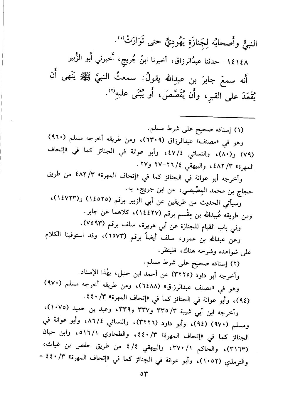 ١٤١٤٨ - حَدَّثَنَا عَبْدُ الرَّزَّاقِ، أَخْبَرَنَا ابْنُ جُرَيْجٍ، أَخْبَرَنِي أَبُو الزُّبَيْرِ، أَنَّهُ: سَمِعَ جَابِرَ بْنَ عَبْدِ اللهِ، يَقُولُ: سَمِعْتُ النَّبِيَّ صَلَّى اللهُ عَلَيْهِ وَسَلَّمَ: " يَنْهَى أَنْ يُقْعَدَ عَلَى الْقَبْرِ، وَأَنْ يُقَصَّصَ، أَوْ يُبْنَى عَلَيْهِ " (٢)