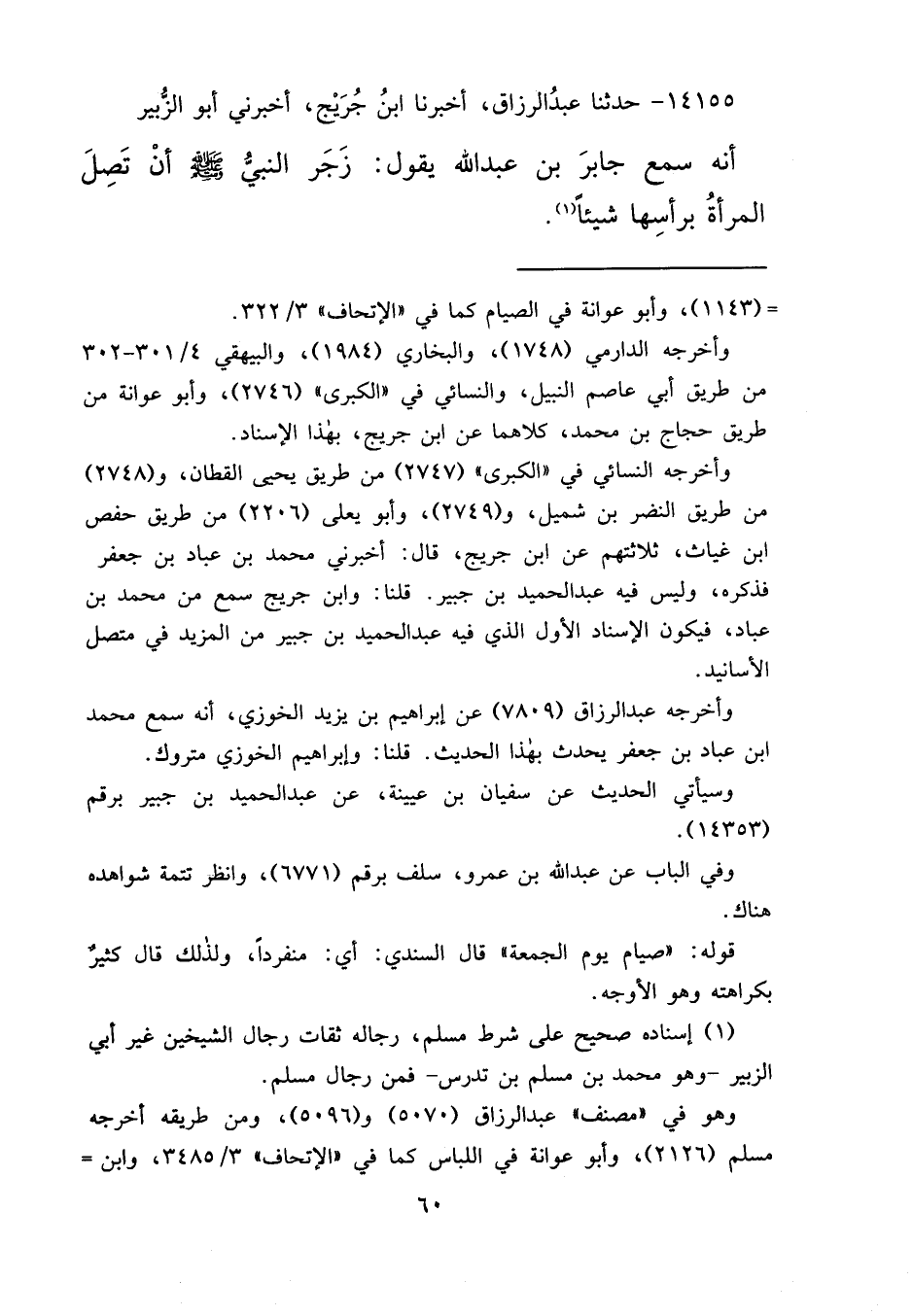 ١٤١٥٥ - حَدَّثَنَا عَبْدُ الرَّزَّاقِ، أَخْبَرَنَا ابْنُ جُرَيْجٍ، أَخْبَرَنِي أَبُو الزُّبَيْرِ، أَنَّهُ سَمِعَ جَابِرَ بْنَ عَبْدِ اللهِ، يَقُولُ: " زَجَرَ النَّبِيُّ صَلَّى اللهُ عَلَيْهِ وَسَلَّمَ أَنْ تَصِلَ الْمَرْأَةُ بِرَأْسِهَا شَيْئًا " (١)