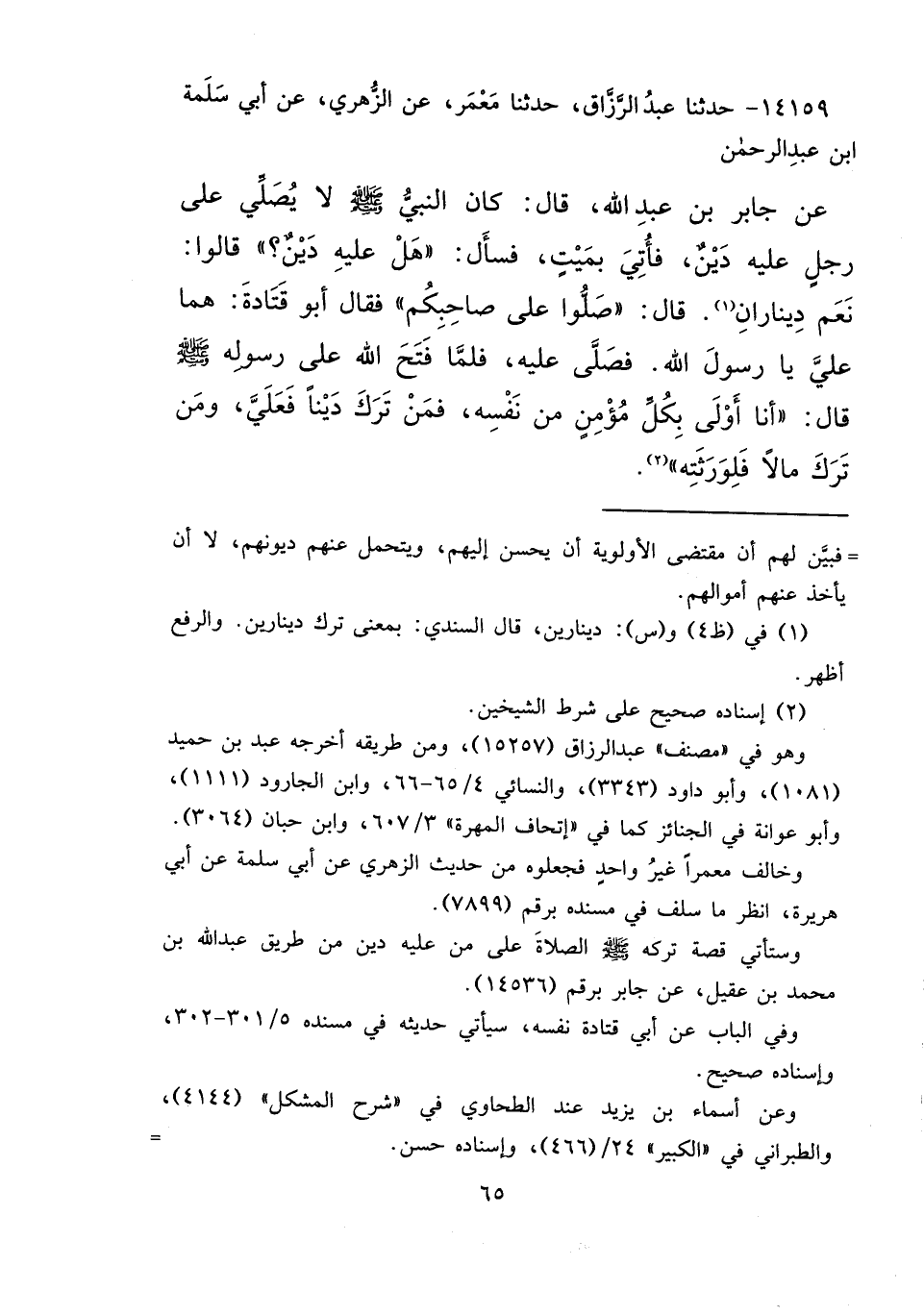 ١٤١٥٩ - حَدَّثَنَا عَبْدُ الرَّزَّاقِ، حَدَّثَنَا مَعْمَرٌ، عَنِ الزُّهْرِيِّ، عَنْ أَبِي سَلَمَةَ بْنِ عَبْدِ الرَّحْمَنِ، عَنْ جَابِرِ بْنِ عَبْدِ اللهِ، قَالَ: كَانَ النَّبِيُّ صَلَّى اللهُ عَلَيْهِ وَسَلَّمَ لَا يُصَلِّي عَلَى رَجُلٍ عَلَيْهِ دَيْنٌ، فَأُتِيَ بِمَيِّتٍ، فَسَأَلَ: " هَلْ عَلَيْهِ دَيْنٌ؟ " قَالُوا: نَعَمْ، دِينَارَانِ (١) ، قَالَ: " صَلُّوا عَلَى صَاحِبِكُمْ "، فَقَالَ أَبُو قَتَادَةَ: هُمَا عَلَيَّ يَا رَسُولَ اللهِ، فَصَلَّى عَلَيْهِ، فَلَمَّا فَتَحَ اللهُ عَلَى رَسُولِهِ صَلَّى اللهُ عَلَيْهِ وَسَلَّمَ، قَالَ: " أَنَا أَوْلَى بِكُلِّ مُؤْمِنٍ مِنْ نَفْسِهِ، فَمَنْ تَرَكَ دَيْنًا فَعَلَيَّ، وَمَنْ تَرَكَ مَالًا فَلِوَرَثَتِهِ " (٢)