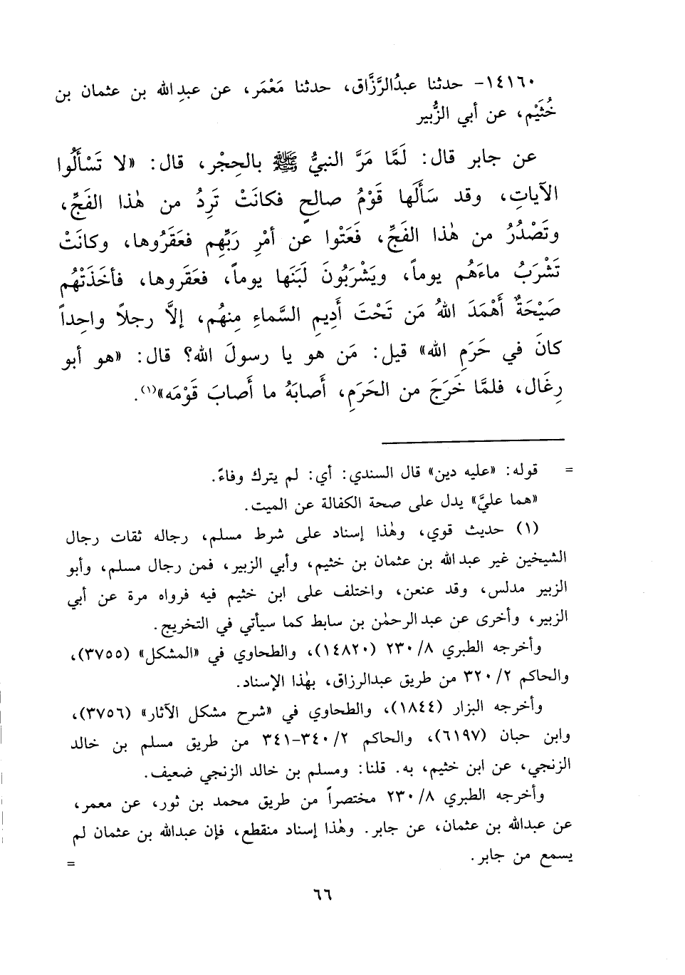 ١٤١٦٠ - حَدَّثَنَا عَبْدُ الرَّزَّاقِ، حَدَّثَنَا مَعْمَرٌ، عَنْ عَبْدِ اللهِ بْنِ عُثْمَانَ بْنِ خُثَيْمٍ، عَنْ أَبِي الزُّبَيْرِ، عَنْ جَابِرٍ، قَالَ: لَمَّا مَرَّ رَسُولُ اللهِ صَلَّى اللهُ عَلَيْهِ وَسَلَّمَ بِالْحِجْرِ، قَالَ: " لَا تَسْأَلُوا الْآيَاتِ، وَقَدْ سَأَلَهَا قَوْمُ صَالِحٍ، فَكَانَتْ تَرِدُ مِنْ هَذَا الْفَجِّ، وَتَصْدُرُ مِنْ هَذَا الْفَجِّ، فَعَتَوْا عَنْ أَمْرِ رَبِّهِمْ، فَعَقَرُوهَا، وَكَانَتْ تَشْرَبُ مَاءَهُمْ يَوْمًا، وَيَشْرَبُونَ لَبَنَهَا يَوْمًا، فَعَقَرُوهَا، فَأَخَذَتْهُمْ صَيْحَةٌ أَهْمَدَ اللهُ مَنْ تَحْتَ أَدِيمِ السَّمَاءِ مِنْهُمْ، إِلَّا رَجُلًا وَاحِدًا كَانَ فِي حَرَمِ اللهِ "، قِيلَ: مَنْ هُوَ يَا رَسُولَ اللهِ؟ قَالَ: " هُوَ أَبُو رِغَالٍ، فَلَمَّا خَرَجَ مِنَ الْحَرَمِ أَصَابَهُ مَا أَصَابَ قَوْمَهُ " (١)