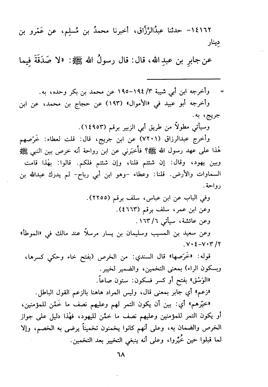 وأخرج عبد الرزاق (٧٢٠١) عن ابن جريج، قال: قلت لعطاء: خَرْصهم هذا على عهد رسول الله صَلَّى اللهُ عَلَيْهِ وَسَلَّمَ؟ فأَخبَرني عن ابن رواحة أنه خرص بين النبي صَلَّى اللهُ عَلَيْهِ وَسَلَّمَ وبين يهود، وقال: إن شئتم فلنا، وإن شئتم فلكم. قالوا: بهذا قامت السماوات والأرض. قلنا: وعطاء- وهو ابن أبي رباح- لم يدرك عبد الله بن رواحة.