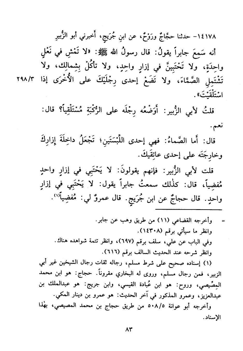 ١٤١٧٨ - حَدَّثَنَا حَجَّاجٌ، وَرَوْحٌ، عَنِ ابْنِ جُرَيْجٍ، أَخْبَرَنِي أَبُو الزُّبَيْرِ، أَنَّهُ: سَمِعَ جَابِرًا، يَقُولُ: قَالَ رَسُولُ اللهِ صَلَّى اللهُ عَلَيْهِ وَسَلَّمَ: " لَا تَمْشِ فِي نَعْلٍ وَاحِدَةٍ، وَلَا تَحْتَبِيَنَّ فِي إِزَارٍ وَاحِدٍ، وَلَا تَأْكُلْ بِشِمَالِكَ، وَلَا تَشْتَمِلْ الصَّمَّاءَ، وَلَا تَضَعْ إِحْدَى رِجْلَيْكَ عَلَى الْأُخْرَى إِذَا اسْتَلْقَيْتَ "، قُلْتُ لِأَبِي الزُّبَيْرِ: أَوَضْعُهُ رِجْلَهُ عَلَى الرُّكْبَةِ مُسْتَلْقِيًا؟ قَالَ: " نَعَمْ "، قَالَ: " أَمَّا الصَّمَّاءُ: فَهِيَ إِحْدَى اللِّبْسَتَيْنِ، تَجْعَلُ دَاخِلَةَ إِزَارِكَ، وَخَارِجَتَهُ عَلَى إِحْدَى عَاتِقَيْكَ "، قُلْتُ لِأَبِي الزُّبَيْرِ: فَإِنَّهُمْ يَقُولُونَ: لَا يَحْتَبِي فِي إِزَارٍ وَاحِدٍ مُفْضِيًا، قَالَ: كَذَلِكَ سَمِعْتُ جَابِرًا يَقُولُ: " لَا يَحْتَبِي فِي إِزَارٍ وَاحِدٍ "، قَالَ حَجَّاجٌ: عَنِ ابْنِ جُرَيْجٍ، قَالَ عَمْرٌو لِي: " مُفْضِيًا " (١)