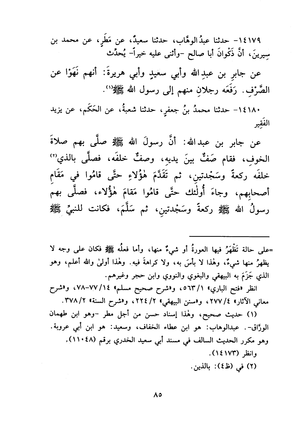 ١٤١٨٠ - حَدَّثَنَا مُحَمَّدُ بْنُ جَعْفَرٍ، حَدَّثَنَا شُعْبَةُ، عَنِ الْحَكَمِ، عَنْ يَزِيدَ الْفَقِيرِ، عَنْ جَابِرِ بْنِ عَبْدِ اللهِ، " أَنَّ رَسُولَ اللهِ صَلَّى اللهُ عَلَيْهِ وَسَلَّمَ، صَلَّى بِهِمْ صَلَاةَ الْخَوْفِ، فَقَامَ صَفٌّ بَيْنَ يَدَيْهِ، وَصَفٌّ خَلْفَهُ، فَصَلَّى بِالَّذِي (٢) خَلْفَهُ رَكْعَةً، وَسَجْدَتَيْنِ، ثُمَّ تَقَدَّمَ هَؤُلَاءِ حَتَّى قَامُوا فِي مَقَامِ أَصْحَابِهِمْ، وَجَاءَ أُولَئِكَ حَتَّى قَامُوا مَقَامَ هَؤُلَاءِ، فَصَلَّى بِهِمْ رَسُولُ اللهِ صَلَّى اللهُ عَلَيْهِ وَسَلَّمَ رَكْعَةً، وَسَجْدَتَيْنِ، ثُمَّ سَلَّمَ، فَكَانَتْ لِلنَّبِيِّ صَلَّى اللهُ عَلَيْهِ وَسَلَّمَ
