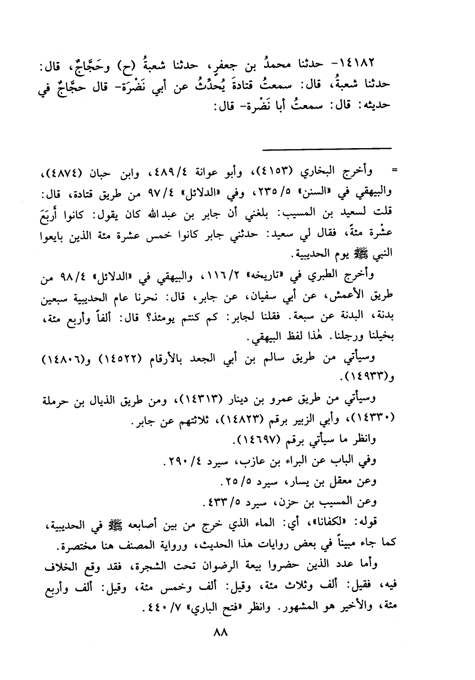 =وأخرج البخاري (٤١٥٣) ، وأبو عوانة٤/٤٨٩، وابن حبان (٤٨٧٤) ، والبيهقي في "السنن"٥/٢٣٥، وفي "الدلائل" ٤/٩٧ من طريق قتادة، قال: قلت لسعيد بن المسيب: بلغني أن جابر بن عبد الله كان يقول: كانوا أربَعَ عشْرة مئةَ، فقال لي سعيد: حدثني جابر كانوا خمس عشرة مئة الذين بايعوا النبي صَلَّى اللهُ عَلَيْهِ وَسَلَّمَ يوم الحديبية.