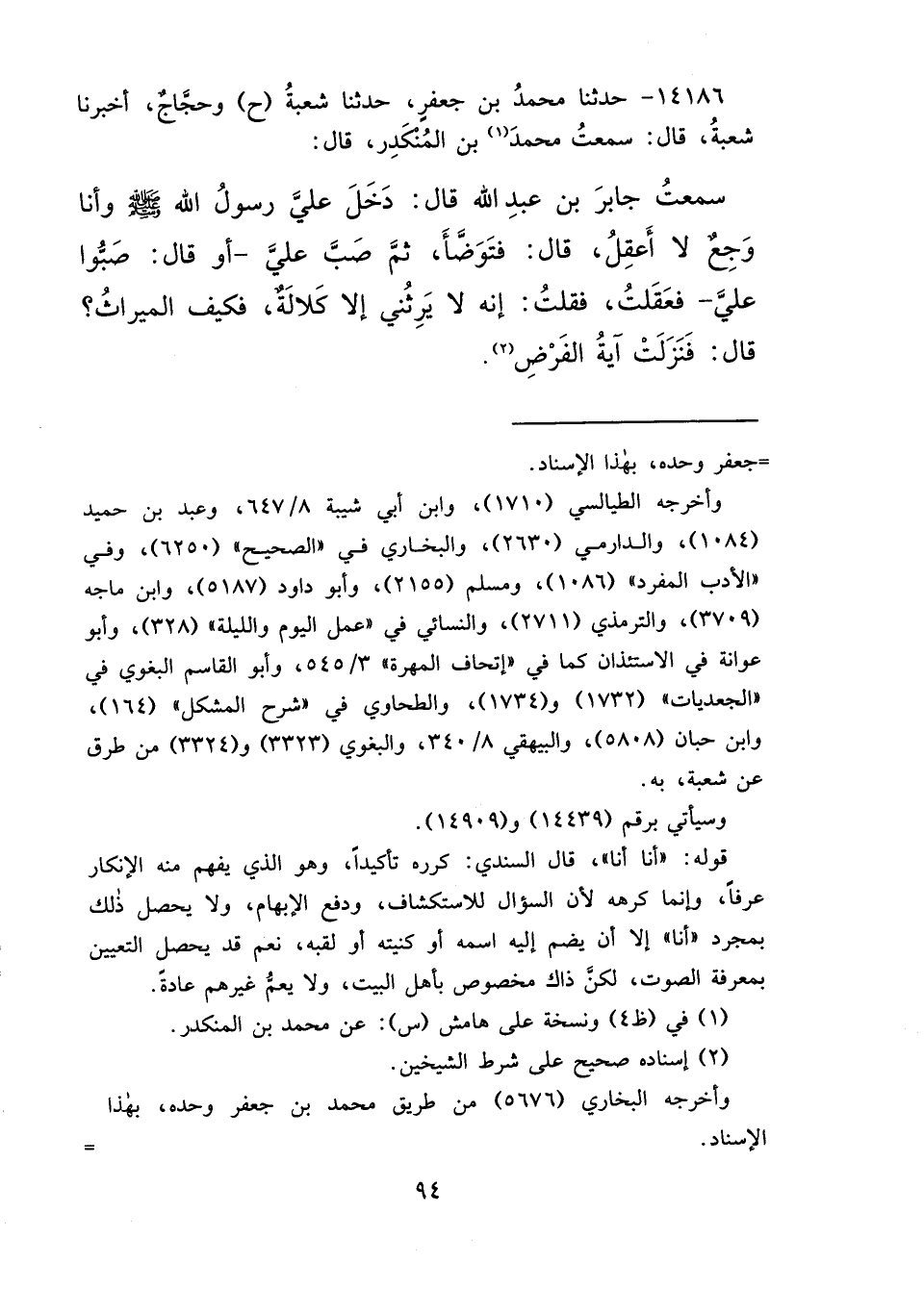 ١٤١٨٦ - حَدَّثَنَا مُحَمَّدُ بْنُ جَعْفَرٍ، حَدَّثَنَا شُعْبَةُ، ح وَحَجَّاجٌ، أَخْبَرَنَا شُعْبَةُ، قَالَ: سَمِعْتُ مُحَمَّدَ (١) بْنَ الْمُنْكَدِرِ، قَالَ: سَمِعْتُ جَابِرَ بْنَ عَبْدِ اللهِ، قَالَ: " دَخَلَ عَلَيَّ رَسُولُ اللهِ صَلَّى اللهُ عَلَيْهِ وَسَلَّمَ وَأَنَا وَجِعٌ لَا أَعْقِلُ "، قَالَ: " فَتَوَضَّأَ، ثُمَّ صَبَّ عَلَيَّ - أَوْ قَالَ: صَبُّوا عَلَيَّ - فَعَقَلْتُ، فَقُلْتُ: إِنَّهُ لَا يَرِثُنِي إِلَّا كَلَالَةٌ، فَكَيْفَ الْمِيرَاثُ؟ قَالَ: فَنَزَلَتْ آيَةُ الْفَرْضِ " (٢)