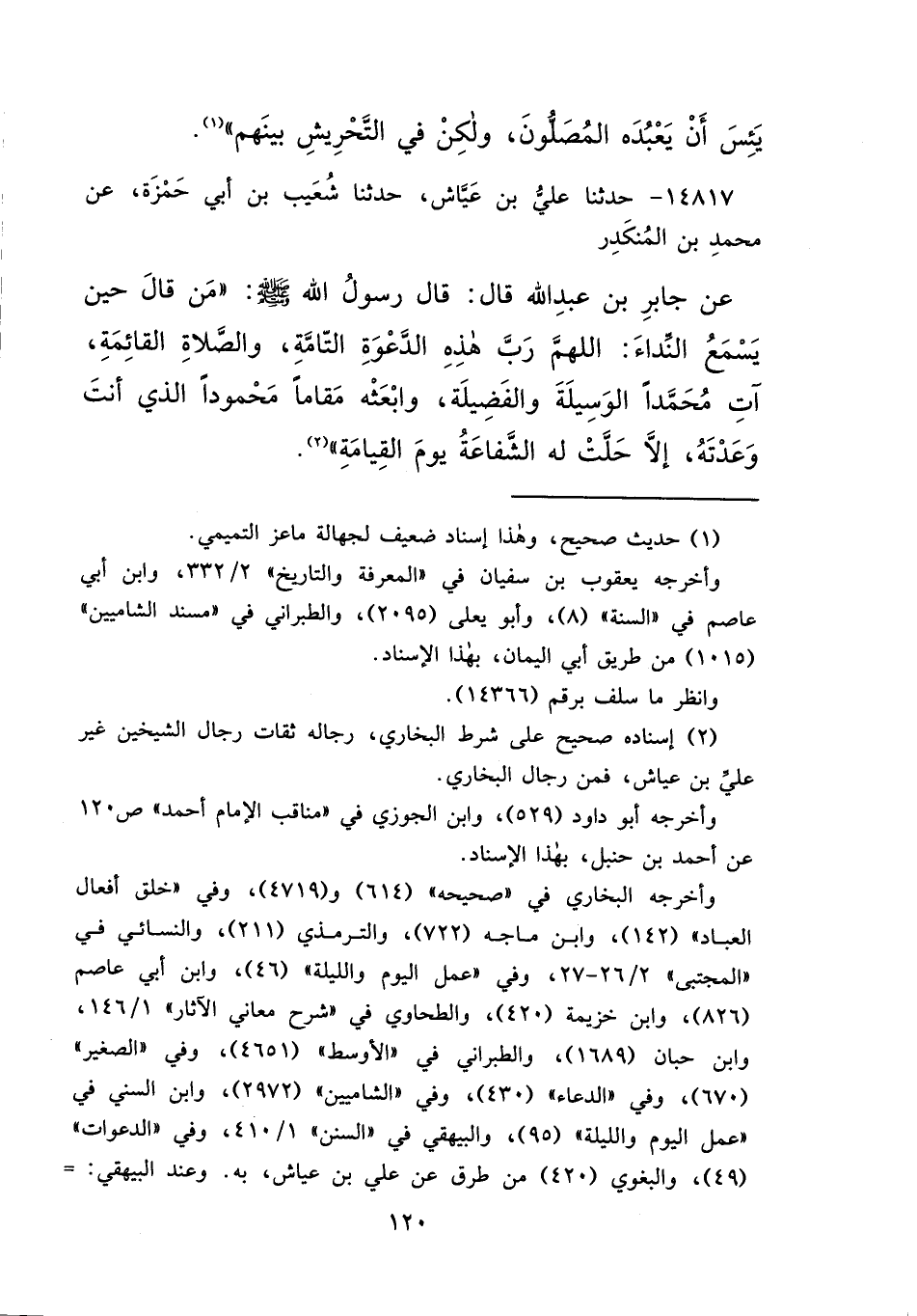 ١٤٨١٧ - حَدَّثَنَا عَلِيُّ بْنُ عَيَّاشٍ، حَدَّثَنَا شُعَيْبُ بْنُ أَبِي حَمْزَةَ، عَنْ مُحَمَّدِ بْنِ الْمُنْكَدِرِ، عَنْ جَابِرِ بْنِ عَبْدِ اللهِ، قَالَ: قَالَ رَسُولُ اللهِ صَلَّى اللهُ عَلَيْهِ وَسَلَّمَ: مَنْ قَالَ حِينَ يَسْمَعُ النِّدَاءَ: " اللهُمَّ رَبَّ هَذِهِ الدَّعْوَةِ التَّامَّةِ، وَالصَّلَاةِ الْقَائِمَةِ، آتِ مُحَمَّدًا الْوَسِيلَةَ وَالْفَضِيلَةَ، وَابْعَثْهُ مَقَامًا مَحْمُودًا الَّذِي أَنْتَ وَعَدْتَهُ، إِلَّا حَلَّتْ لَهُ الشَّفَاعَةُ يَوْمَ الْقِيَامَةِ " (٢)