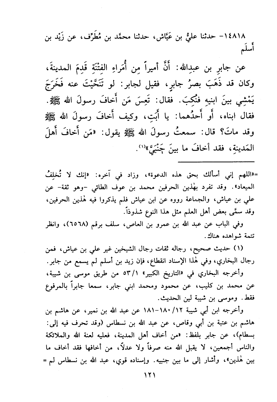 ١٤٨١٨ - حَدَّثَنَا عَلِيُّ بْنُ عَيَّاشٍ، حَدَّثَنَا مُحَمَّدُ بْنُ مُطَرِّفٍ، عَنْ زَيْدِ بْنِ أَسْلَمَ، عَنْ جَابِرِ بْنِ عَبْدِ اللهِ، أَنَّ أَمِيرًا مِنْ أُمَرَاءِ الْفِتْنَةِ قَدِمَ الْمَدِينَةَ، وَكَانَ قَدْ ذَهَبَ بَصَرُ جَابِرٍ، فَقِيلَ لِجَابِرٍ: لَوْ تَنَحَّيْتَ عَنْهُ، فَخَرَجَ يَمْشِي بَيْنَ ابْنَيْهِ فَنُكِّبَ، فَقَالَ: تَعِسَ مَنْ أَخَافَ رَسُولَ اللهِ صَلَّى اللهُ عَلَيْهِ وَسَلَّمَ، فَقَالَ ابْنَاهُ - أَوْ أَحَدُهُمَا -: يَا أَبَتِ، وَكَيْفَ أَخَافَ رَسُولَ اللهِ صَلَّى اللهُ عَلَيْهِ وَسَلَّمَ، وَقَدْ مَاتَ، قَالَ: سَمِعْتُ رَسُولَ اللهِ صَلَّى اللهُ عَلَيْهِ وَسَلَّمَ يَقُولُ: " مَنْ أَخَافَ أَهْلَ الْمَدِينَةِ، فَقَدْ أَخَافَ مَا بَيْنَ جَنْبَيَّ " (١)
