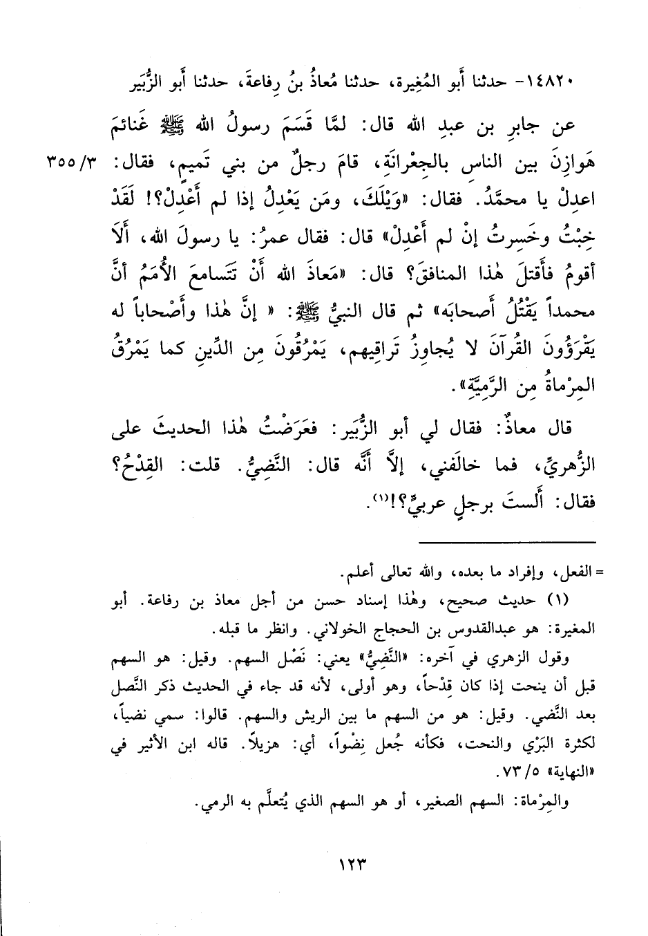 ١٤٨٢٠ - حَدَّثَنَا أَبُو الْمُغِيرَةِ، حَدَّثَنَا مُعَانُ بْنُ رِفَاعَةَ، حَدَّثَنَا أَبُو الزُّبَيْرِ، عَنْ جَابِرِ بْنِ عَبْدِ اللهِ، قَالَ: لَمَّا قَسَمَ رَسُولُ اللهِ صَلَّى اللهُ عَلَيْهِ وَسَلَّمَ غَنَائِمَ هَوَازِنَ بَيْنَ النَّاسِ بِالْجِعْرَانَةِ، قَامَ رَجُلٌ مِنْ بَنِي تَمِيمٍ، فَقَالَ: اعْدِلْ يَا مُحَمَّدُ، فَقَالَ: " وَيْلَكَ، وَمَنْ يَعْدِلُ إِذَا لَمْ أَعْدِلْ، لَقَدْ خِبْتُ وَخَسِرْتُ إِنْ لَمْ أَعْدِلْ " قَالَ: فَقَالَ عُمَرُ: يَا رَسُولَ اللهِ، أَلَا أَقُومُ فَأَقْتُلَ هَذَا الْمُنَافِقَ، قَالَ: " مَعَاذَ اللهِ أَنْ تَتَسَامَعَ الْأُمَمُ أَنَّ مُحَمَّدًا يَقْتُلُ أَصْحَابَهُ "، ثُمَّ قَالَ النَّبِيُّ صَلَّى اللهُ عَلَيْهِ وَسَلَّمَ: " إِنَّ هَذَا وَأَصْحَابًا لَهُ يَقْرَءُونَ الْقُرْآنَ لَا يُجَاوِزُ تَرَاقِيَهُمْ، يَمْرُقُونَ مِنَ الدِّينِ، كَمَا يَمْرُقُ الْمِرْمَاةُ مِنَ الرَّمِيَّةِ "، قَالَ مُعَاذٌ: فَقَالَ لِي أَبُو الزُّبَيْرِ: فَعَرَضْتُ هَذَا الْحَدِيثَ عَلَى الزُّهْرِيِّ فَمَا خَالَفَنِي، إِلَّا أَنَّهُ قَالَ: النَّضِيَّ؟ قُلْتُ: الْقِدْحَ، فَقَالَ: " أَلَسْتَ بِرَجُلٍ عَرَبِيٍّ؟ " (١)