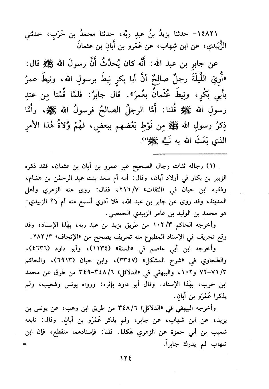 ١٤٨٢١ - حَدَّثَنَا يَزِيدُ بْنُ عَبْدِ رَبِّهِ، حَدَّثَنَا مُحَمَّدُ بْنُ حَرْبٍ، حَدَّثَنِي الزُّبَيْدِيُّ، عَنْ ابْنِ شِهَابٍ، عَنْ عَمْرِو بْنِ أَبَانَ بْنِ عُثْمَانَ، عَنْ جَابِرِ بْنِ عَبْدِ اللهِ، أَنَّهُ كَانَ يُحَدِّثُ أَنَّ رَسُولَ اللهِ صَلَّى اللهُ عَلَيْهِ وَسَلَّمَ قَالَ: " أُرِيَ اللَّيْلَةَ رَجُلٌ صَالِحٌ أَنَّ أَبَا بَكْرٍ نِيطَ بِرَسُولِ اللهِ، وَنِيطَ عُمَرُ بِأَبِي بَكْرٍ، وَنِيطَ عُثْمَانُ بِعُمَرَ "، قَالَ جَابِرٌ: فَلَمَّا قُمْنَا مِنْ عِنْدِ رَسُولِ اللهِ صَلَّى اللهُ عَلَيْهِ وَسَلَّمَ قُلْنَا: أَمَّا الرَّجُلُ الصَّالِحُ فَرَسُولُ اللهِ صَلَّى اللهُ عَلَيْهِ وَسَلَّمَ، وَأَمَّا ذِكْرُ رَسُولِ اللهِ صَلَّى اللهُ عَلَيْهِ وَسَلَّمَ مِنْ نَوْطِ بَعْضِهِمْ لِبَعْضٍ، فَهُمْ وُلَاةُ هَذَا الْأَمْرِ الَّذِي بَعَثَ اللهُ بِهِ نَبِيَّهُ صَلَّى اللهُ عَلَيْهِ وَسَلَّمَ (١)