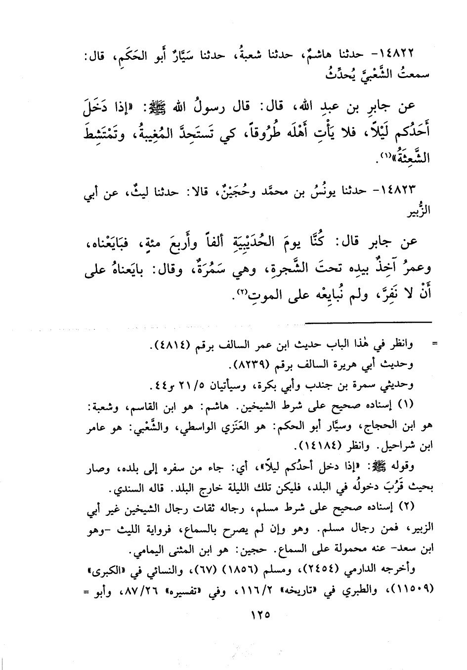١٤٨٢٢ - حَدَّثَنَا هَاشِمٌ، حَدَّثَنَا شُعْبَةُ، حَدَّثَنَا سَيَّارٌ أَبُو الْحَكَمِ، قَالَ: سَمِعْتُ الشَّعْبِيَّ، يُحَدِّثُ عَنْ جَابِرِ بْنِ عَبْدِ اللهِ، قَالَ: قَالَ رَسُولُ اللهِ صَلَّى اللهُ عَلَيْهِ وَسَلَّمَ: " إِذَا دَخَلَ أَحَدُكُمْ لَيْلًا، فَلَا يَأْتِ أَهْلَهُ طُرُوقًا، كَيْ تَسْتَحِدَّ الْمُغِيبَةُ، وَتَمْتَشِطَ الشَّعِثَةُ " (١)