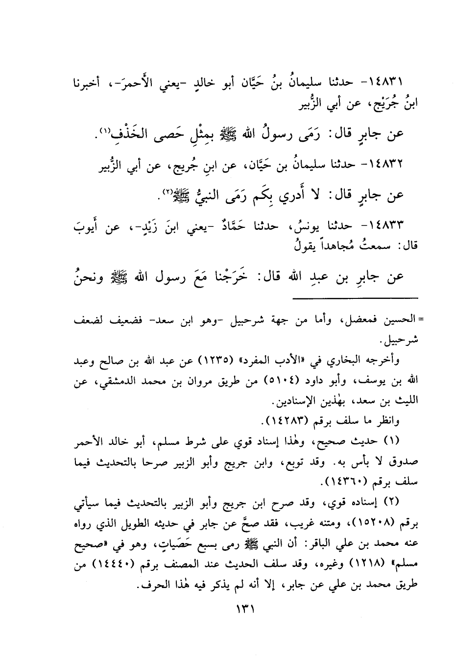 ١٤٨٣٢ - حَدَّثَنَا سُلَيْمَانُ بْنُ حَيَّانَ، عَنْ ابْنِ جُرَيْجٍ، عَنْ أَبِي الزُّبَيْرِ، عَنْ جَابِرٍ، قَالَ: " لَا أَدْرِي بِكَمْ رَمَى النَّبِيُّ صَلَّى اللهُ عَلَيْهِ وَسَلَّمَ " (٢)