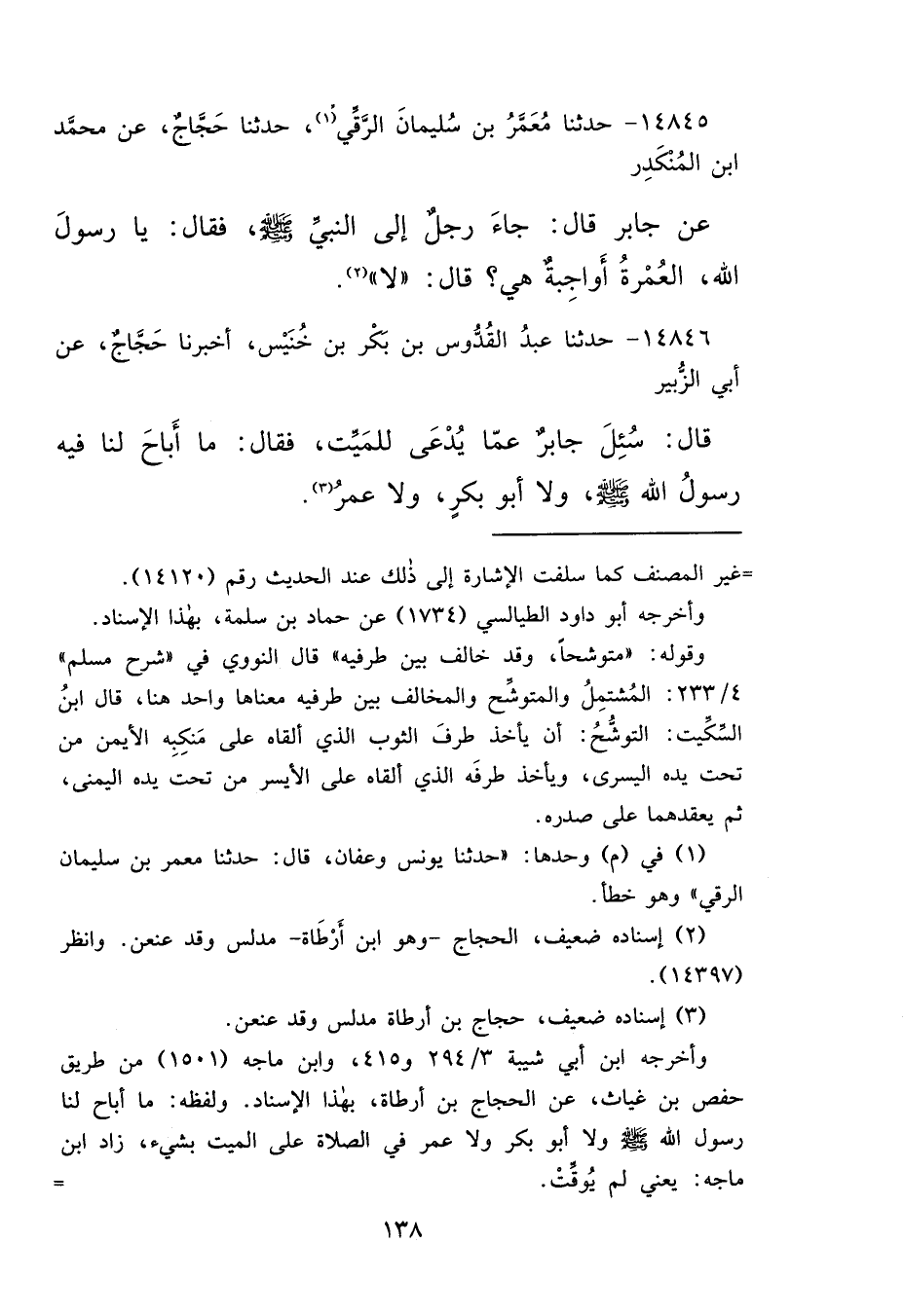 (٣) إسناده ضعيف، حجاج بن أرطاة مدلس وقد عنعن.