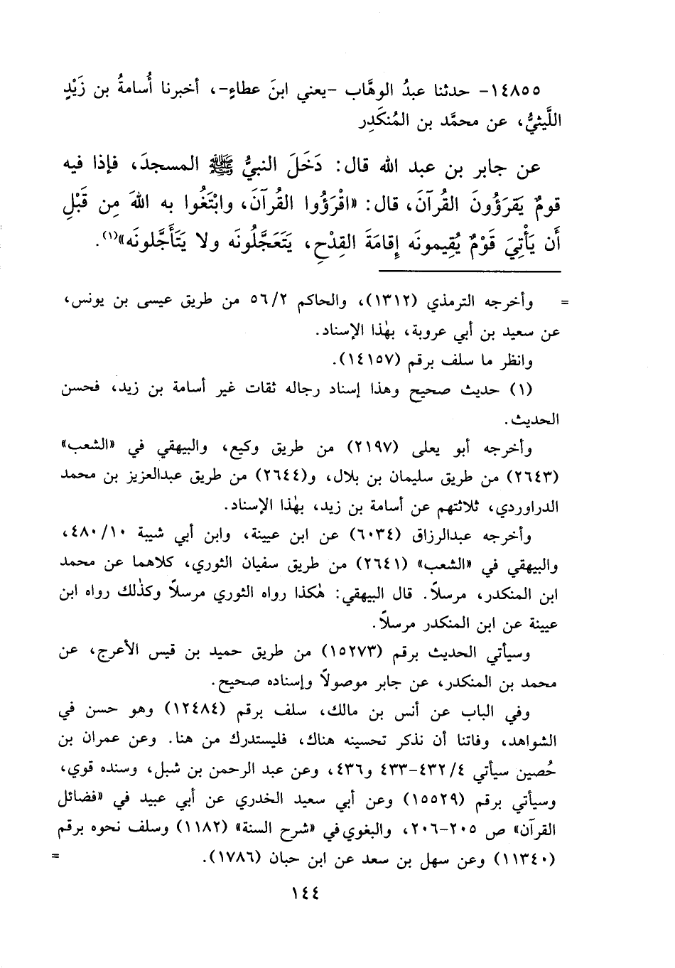١٤٨٥٥ - حَدَّثَنَا عَبْدُ الْوَهَّابِ يَعْنِي ابْنَ عَطَاءٍ، أَخْبَرَنَا أُسَامَةُ بْنُ زَيْدٍ اللَّيْثِيُّ، عَنْ مُحَمَّدِ بْنِ الْمُنْكَدِرِ، عَنْ جَابِرِ بْنِ عَبْدِ اللهِ، قَالَ: دَخَلَ النَّبِيُّ صَلَّى اللهُ عَلَيْهِ وَسَلَّمَ الْمَسْجِدَ، فَإِذَا فِيهِ قَوْمٌ يَقْرَءُونَ الْقُرْآنَ، قَالَ: " اقْرَءُوا الْقُرْآنَ، وَابْتَغُوا بِهِ اللهَ، مِنْ قَبْلِ أَنْ يَأْتِيَ قَوْمٌ يُقِيمُونَهُ إِقَامَةَ الْقِدْحِ، يَتَعَجَّلُونَهُ، وَلَا يَتَأَجَّلُونَهُ " (١)