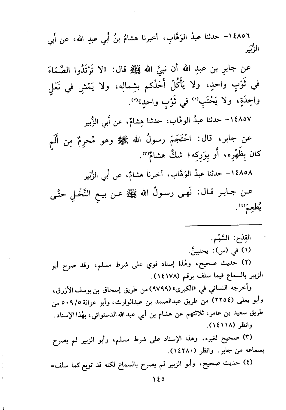 ١٤٨٥٦ - حَدَّثَنَا عَبْدُ الْوَهَّابِ، أَخْبَرَنَا هِشَامُ بْنُ أَبِي عَبْدِ اللهِ، عَنْ أَبِي الزُّبَيْرِ، عَنْ جَابِرِ بْنِ عَبْدِ اللهِ، أَنَّ نَبِيَّ اللهِ صَلَّى اللهُ عَلَيْهِ وَسَلَّمَ قَالَ: " لَا تَرْتَدُوا الصَّمَّاءَ فِي ثَوْبٍ وَاحِدٍ، وَلَا يَأْكُلْ أَحَدُكُمْ بِشِمَالِهِ، وَلَا يَمْشِ فِي نَعْلٍ وَاحِدَةٍ، وَلَا يَحْتَبِ (١) فِي ثَوْبٍ وَاحِدٍ " (٢)